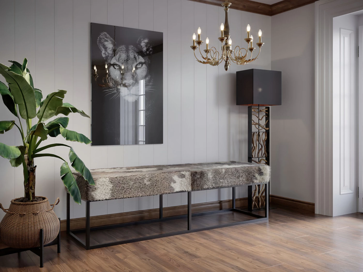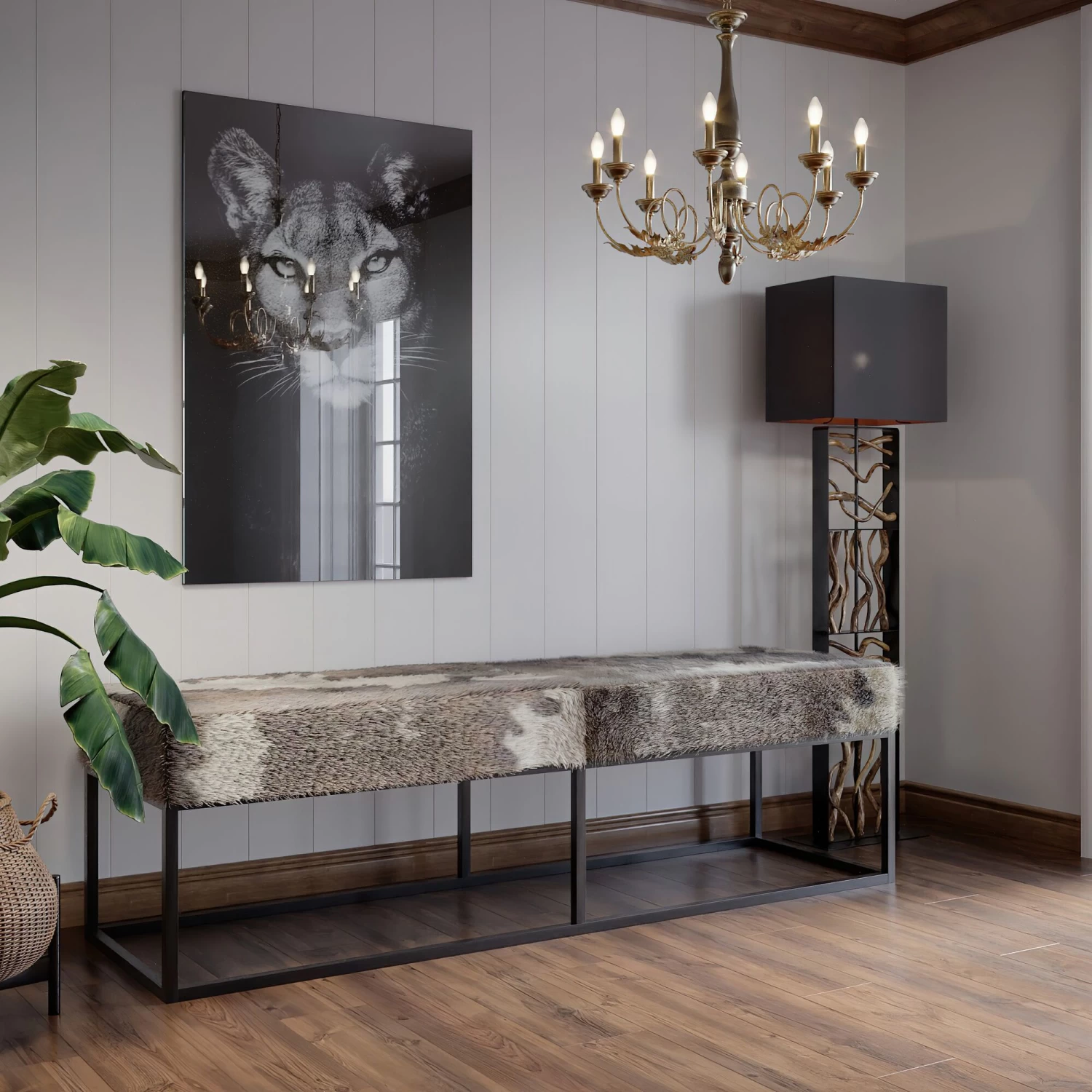 - Rechteckige Sitzbank mit schwarzem Stahlgestell und einem Bezug aus echtem Ziegenfell – jeder Polsterbank ist ein Unikat