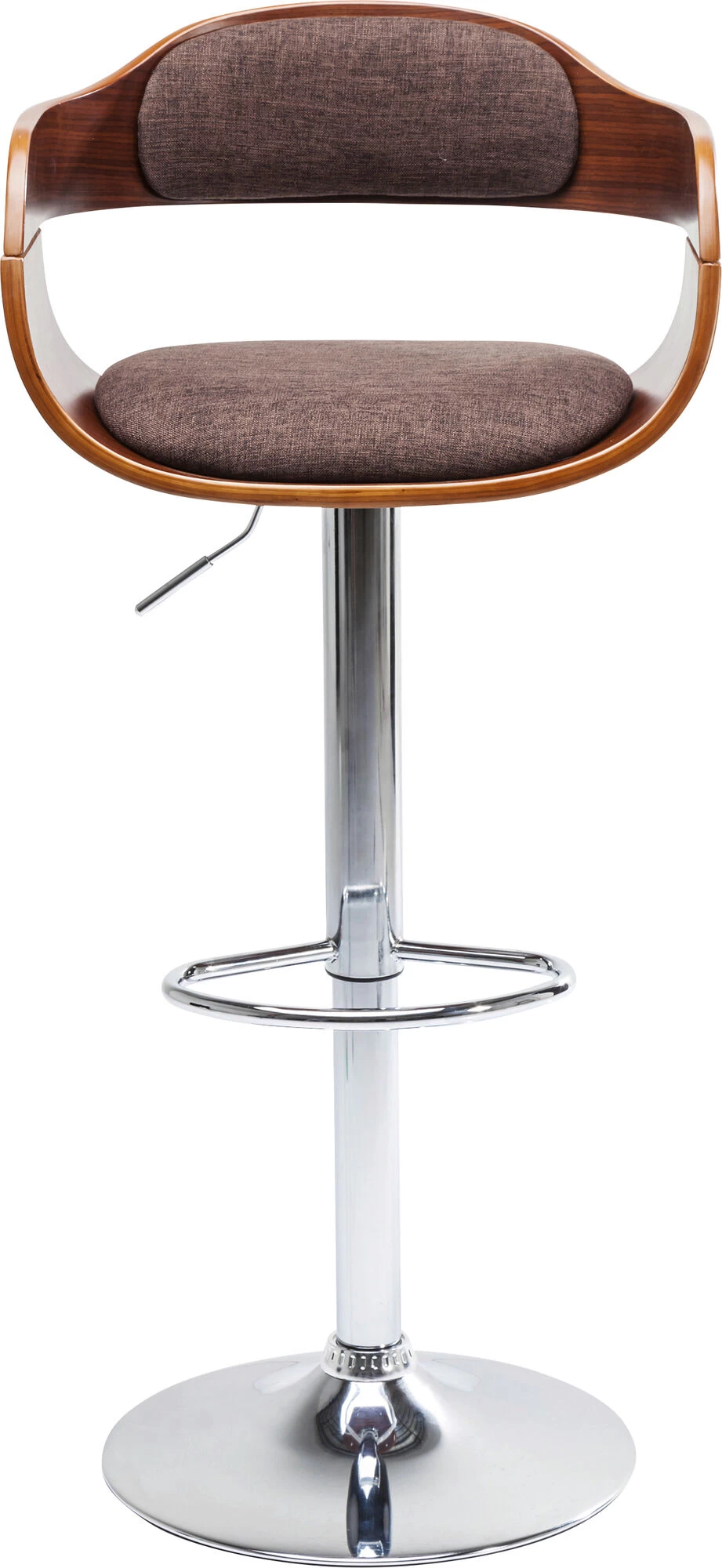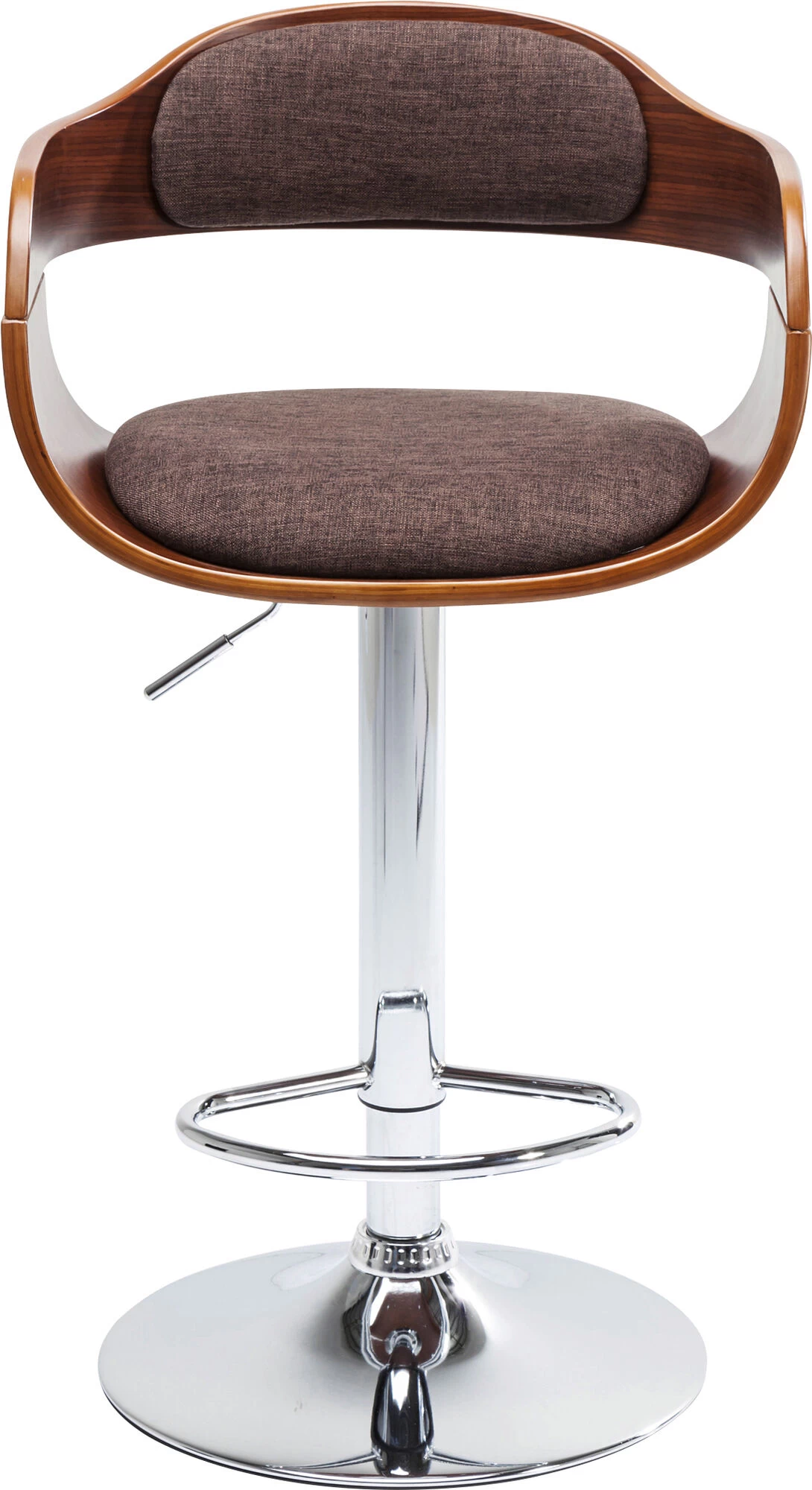 - Höhenverstellbarer Barhocker mit rundem, chromfarbenem Stahl-Fuß, schokobraunem Stoffbezug und einer Fußstütze
