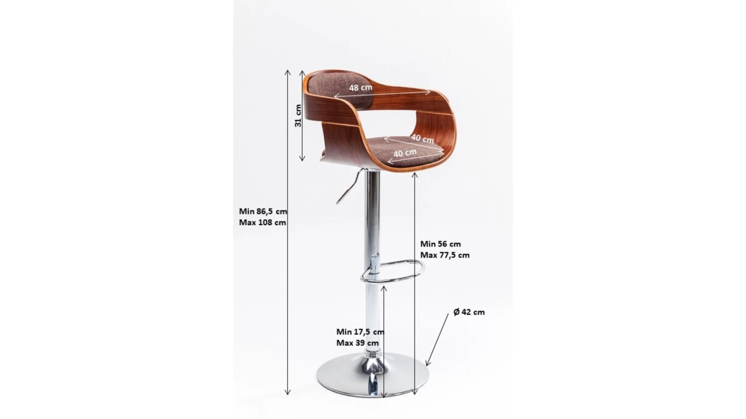 - Dank der Gasdruckfeder ist dieser Barstuhl von 58 auf 79 cm höhenverstellbar