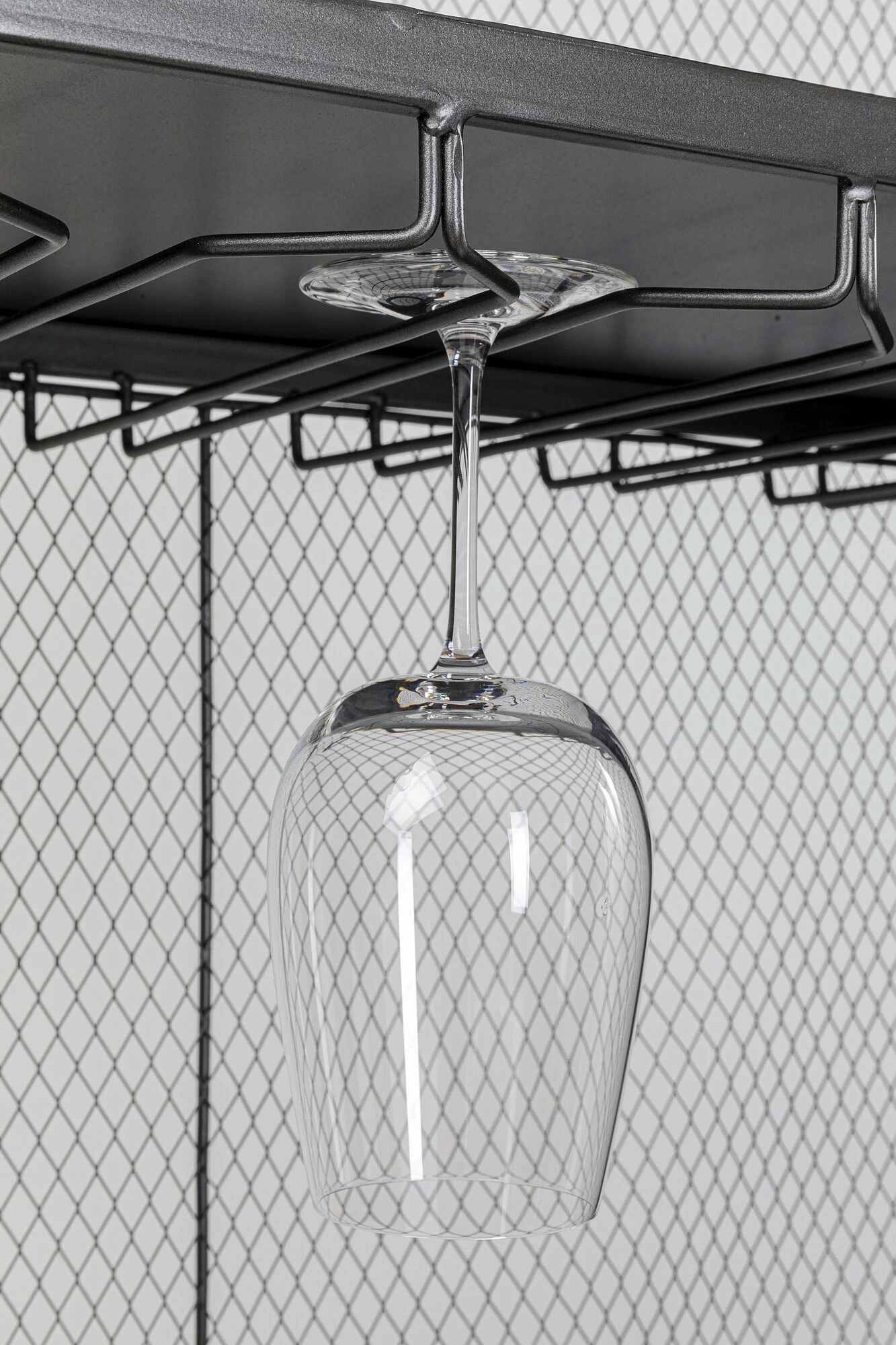 - Barkeeper lieben Ordnung, darum bietet dieses Stahlregal Schienen zum Aufhängen von Stielgläsern, Flaschenfächer und eine Schublade