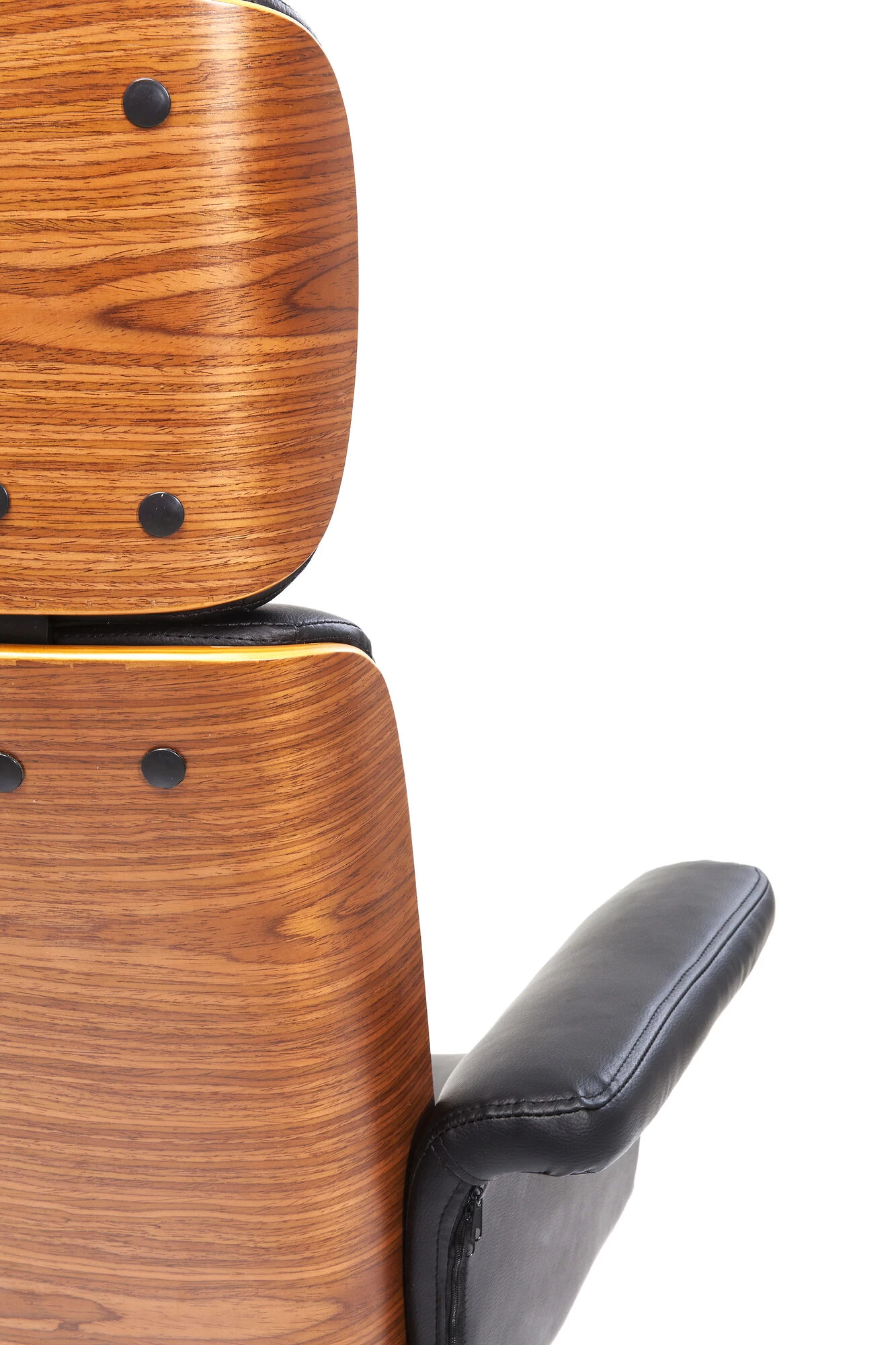 - Ausgesucht schöner Chefsessel: ein Bürodrehstuhl mit edler Furnierholzschale und bequemer Polsterung in schwarzer Lederoptik