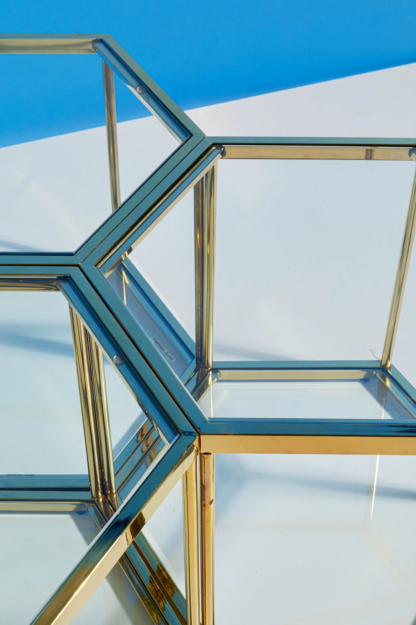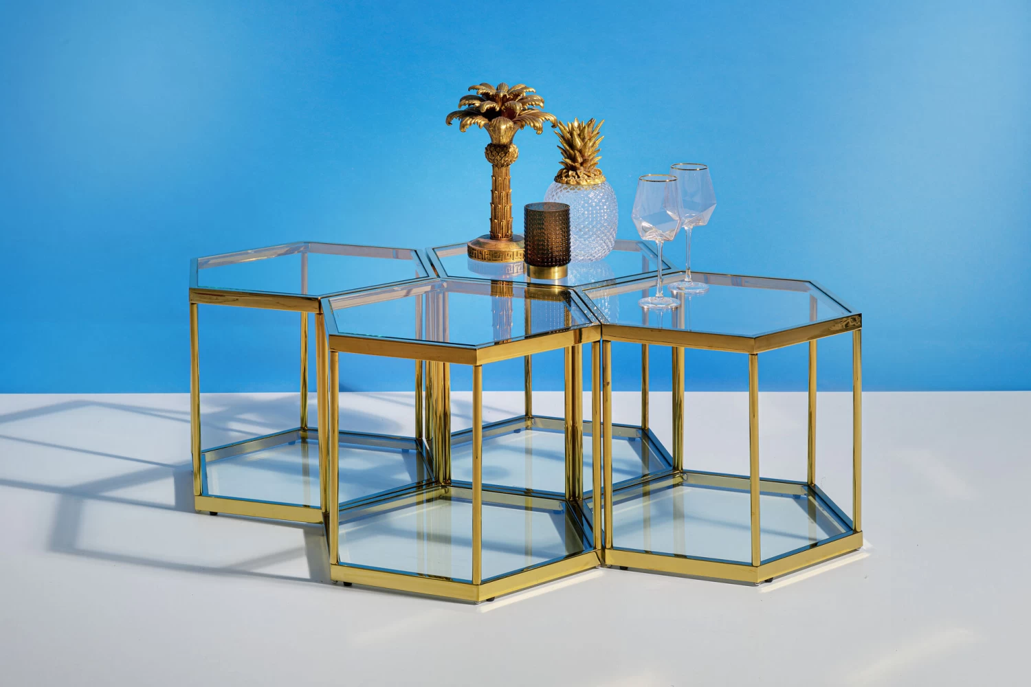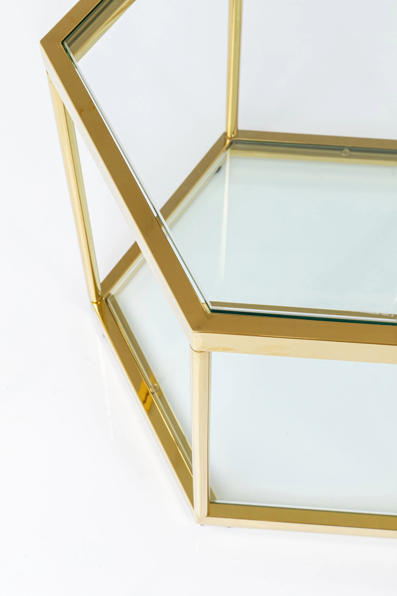 - Modern Glam – Sechseckiger Glas-Couchtisch mit einem Gestell aus goldfarbenem Stahl