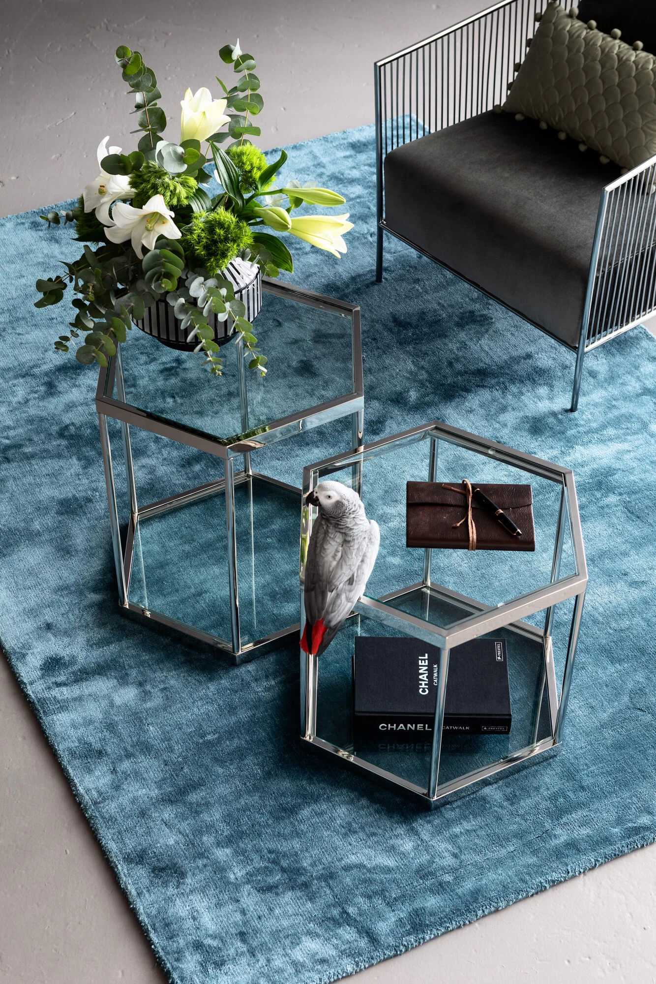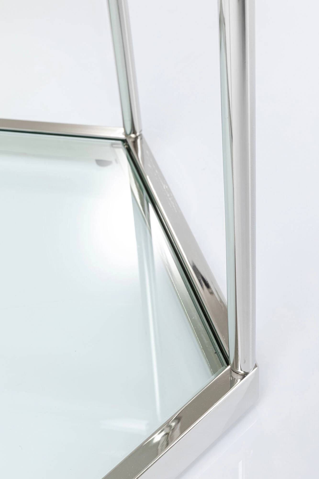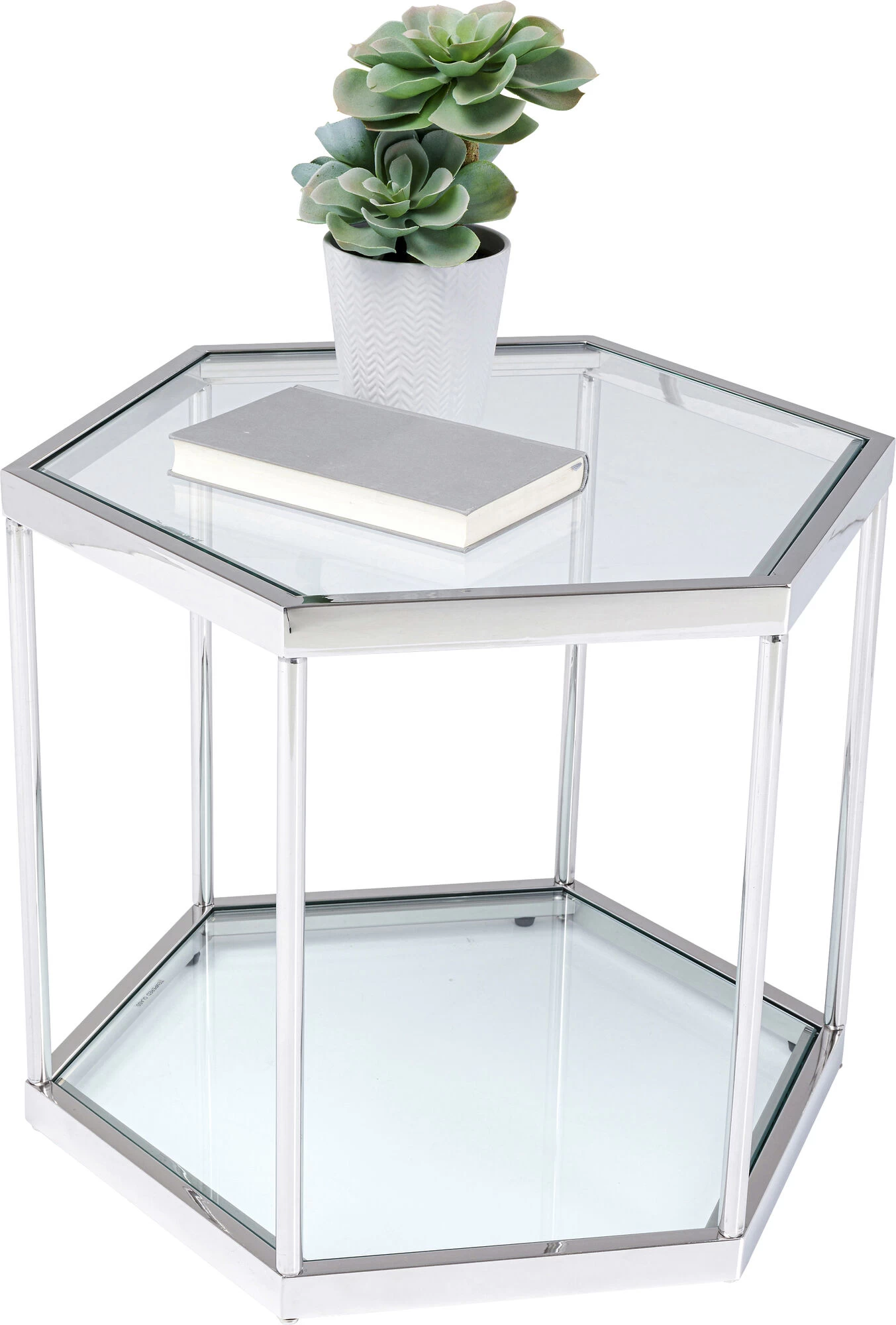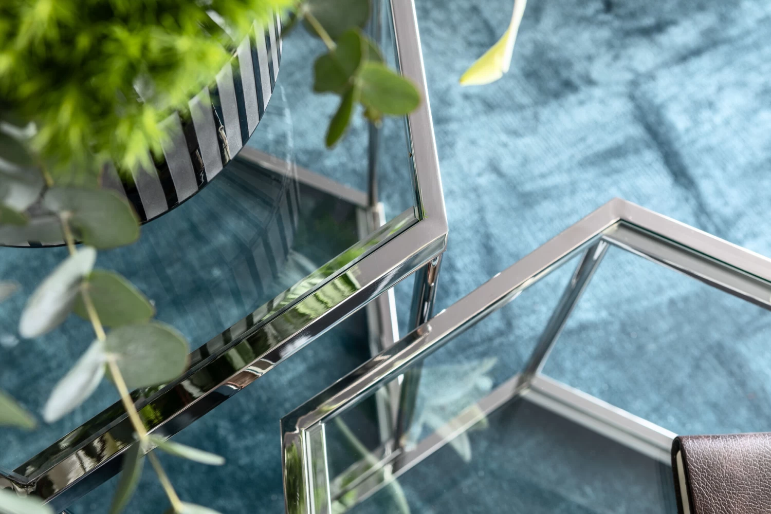 - Modern Glam – Sechseckiger Glas-Couchtisch mit einem Gestell aus silberfarbenem Stahl