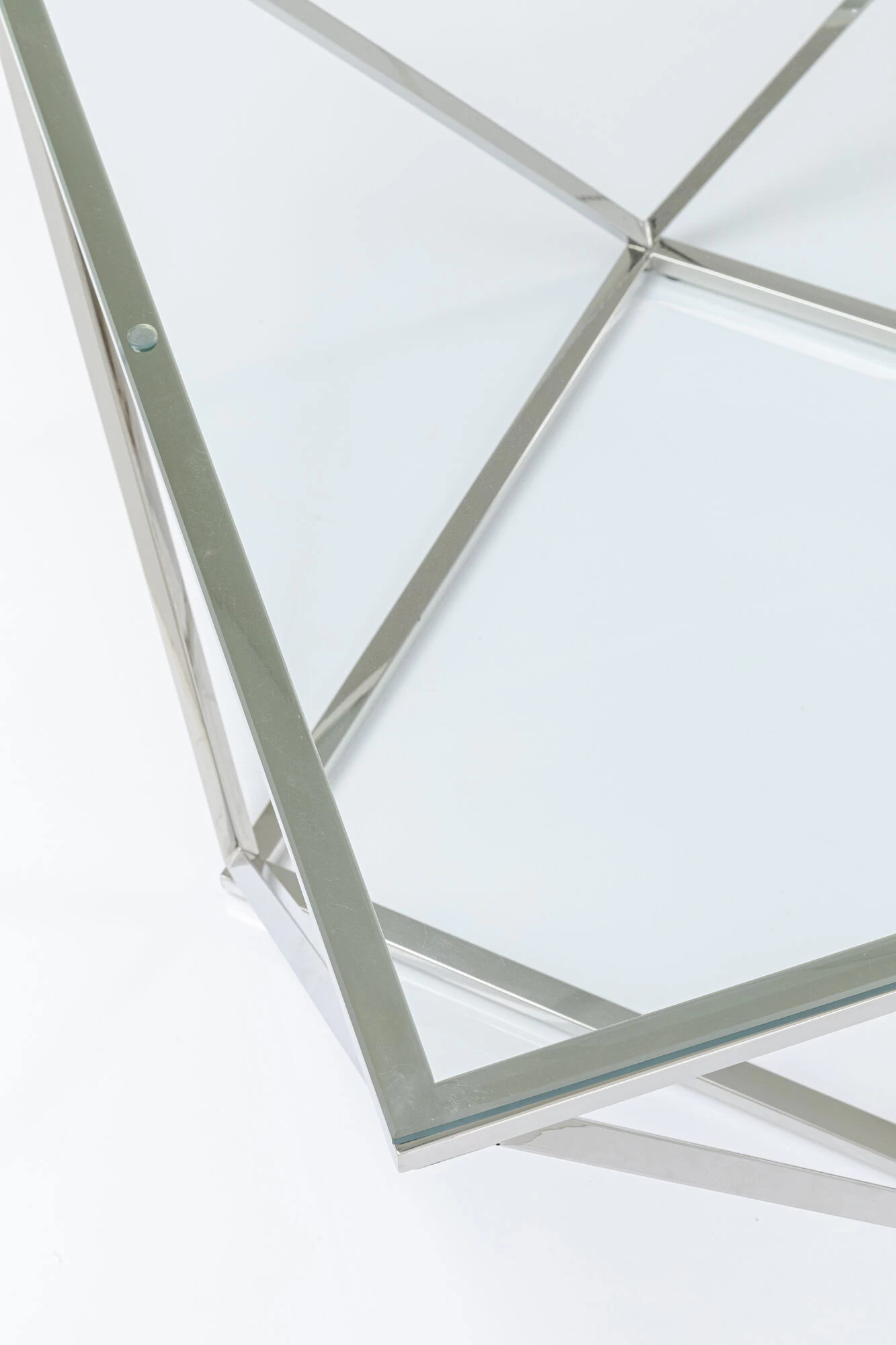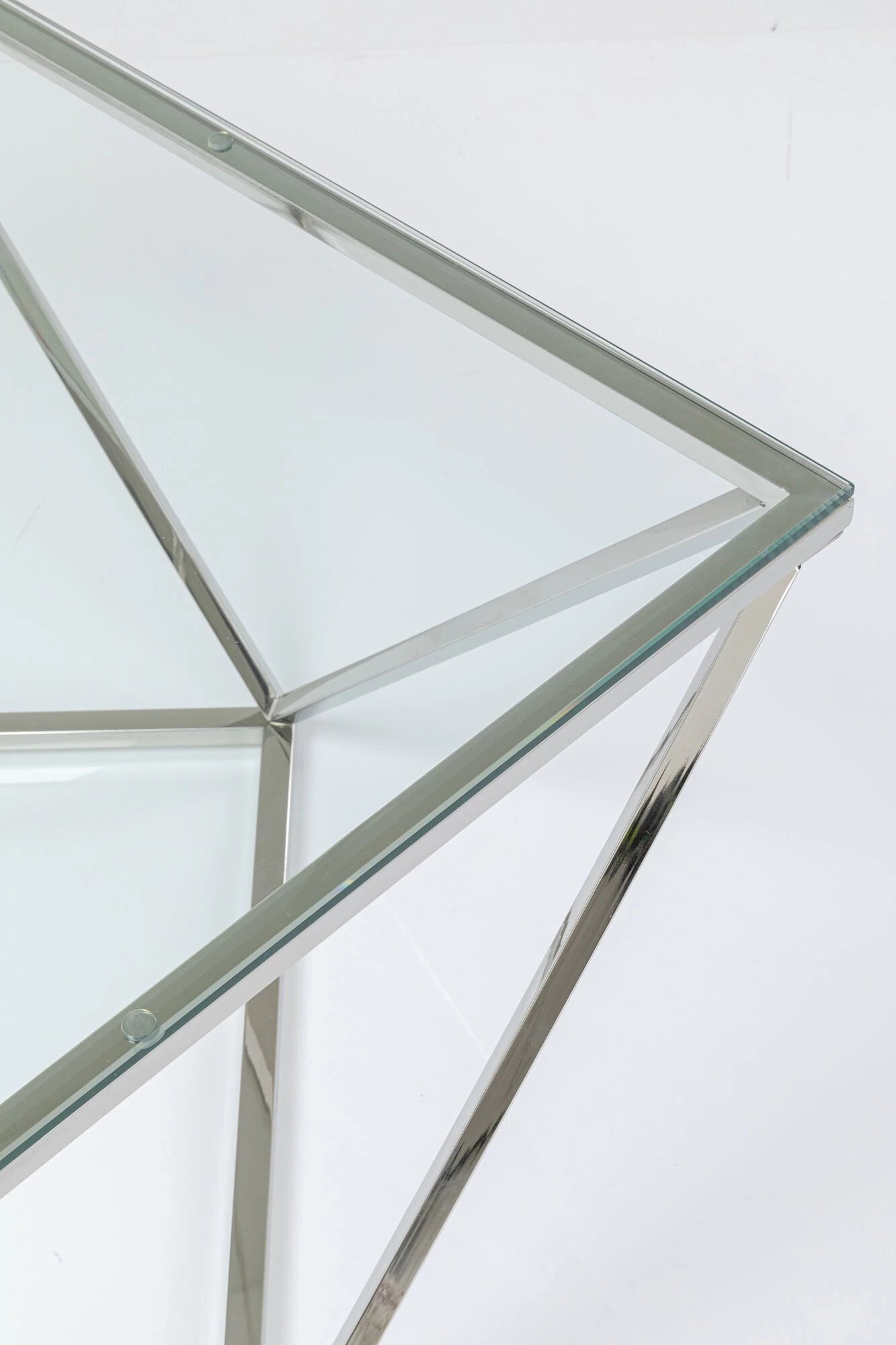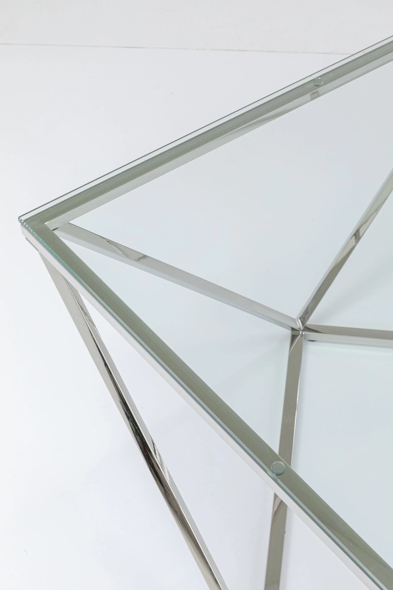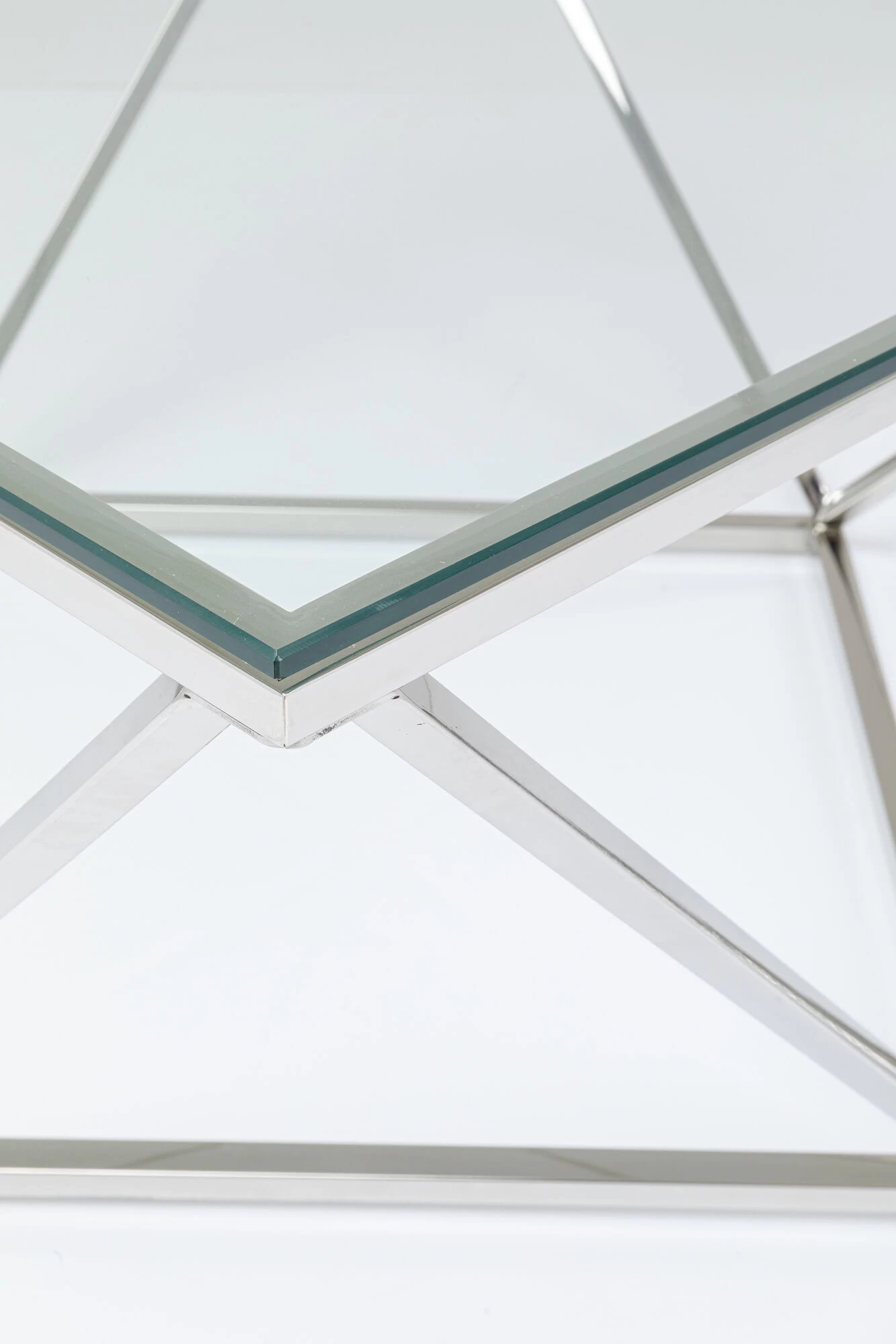 - Quadratischer Glastisch mit geometrischem Gestell aus poliertem Edelstahl für Fans des puren Looks