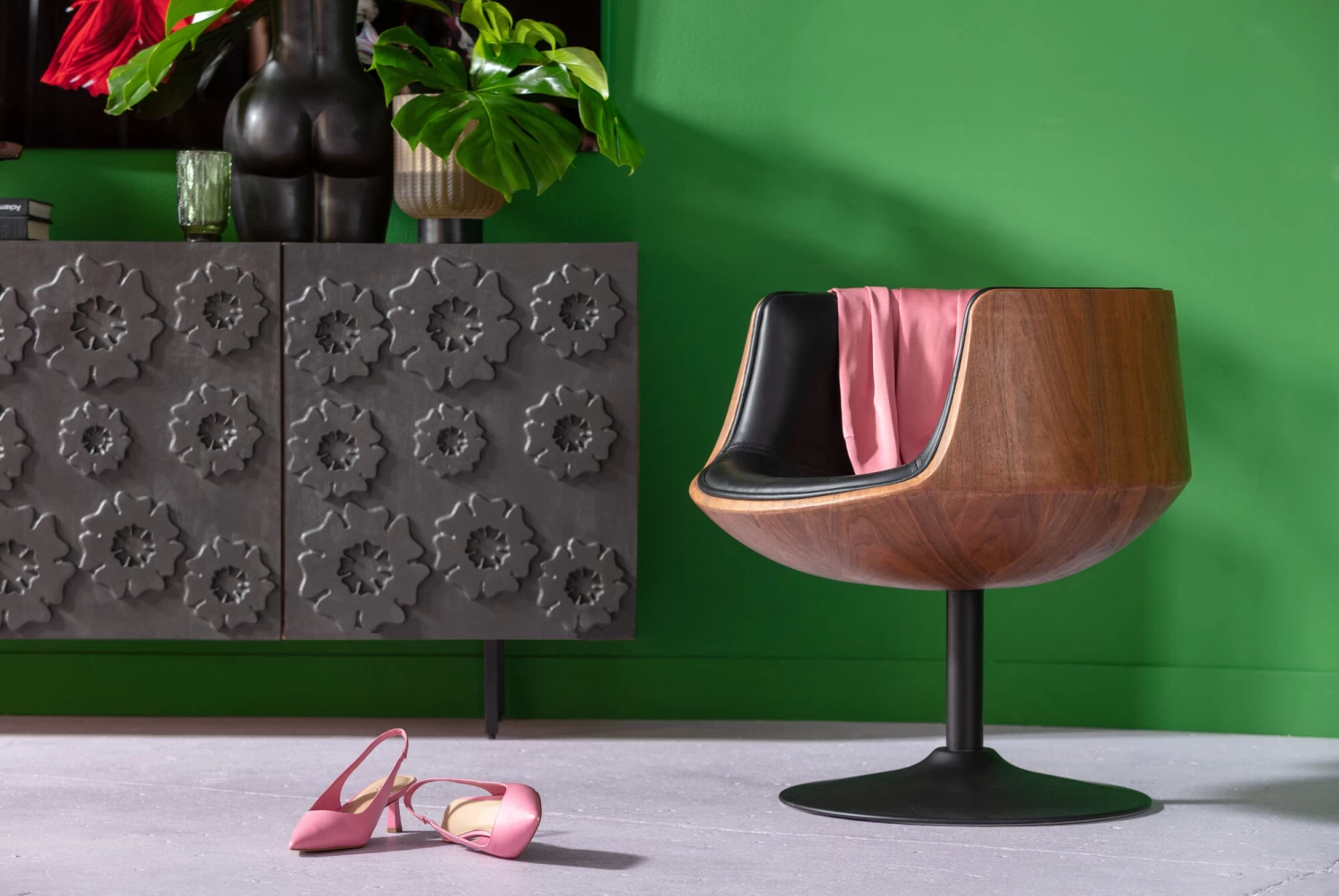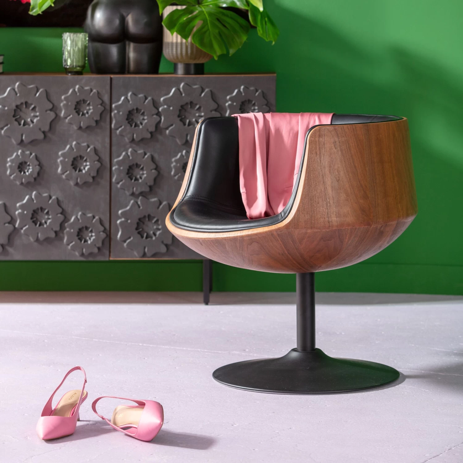 - Club-Drehsessel in schwarzer Lederoptik und mit einer Schale, die außen mit edlem Walnussfurnier versehen ist