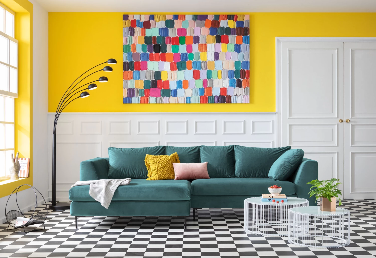 - Modernes Eck-Sofa mit aktuellem Samtbezug in der Farbe Petrol und fünf legeren Wurfkissen. Besonders bequem: die breite Recamière