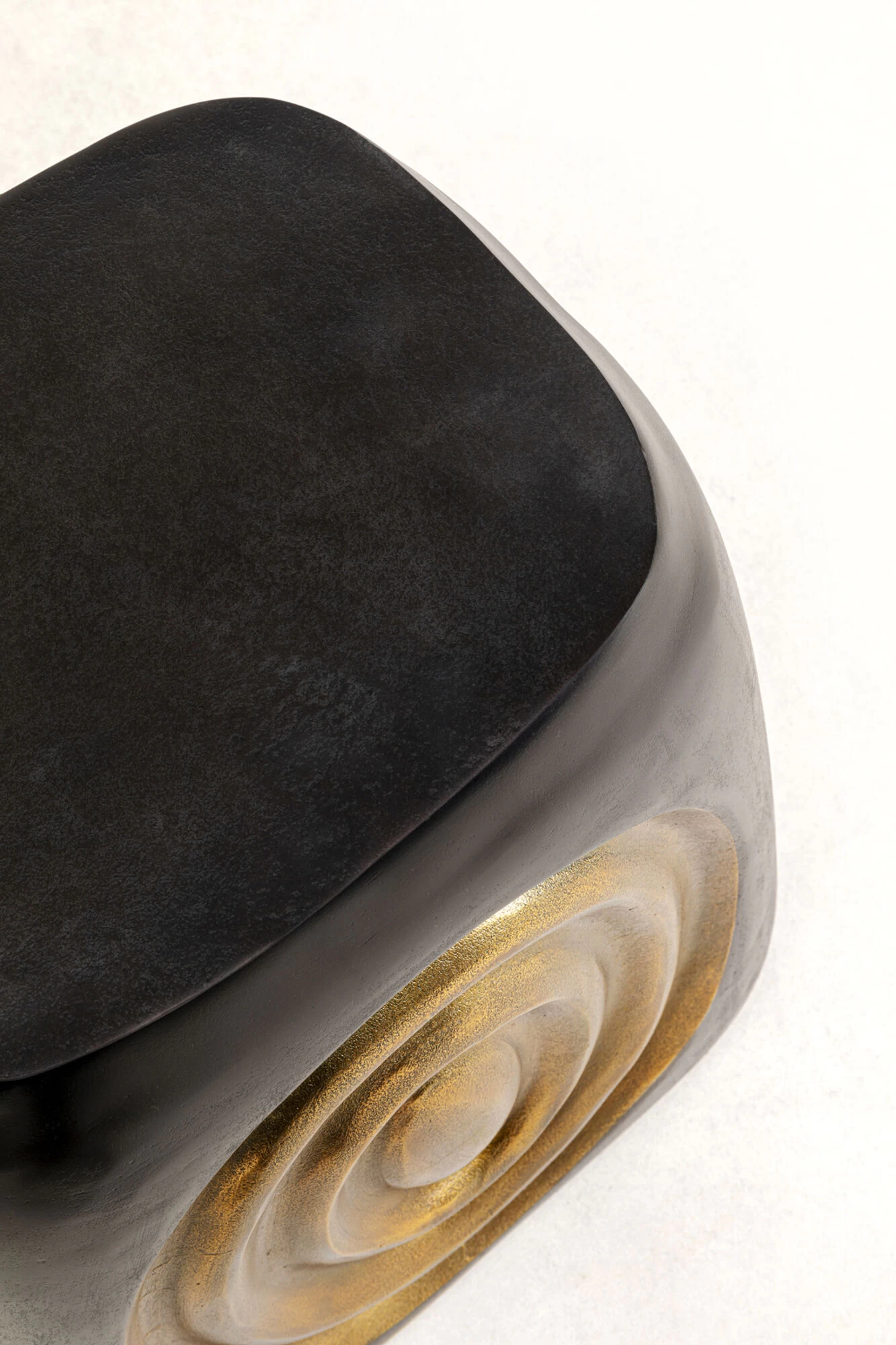 - Goldenfarbene Spiralform im Fokus des Hockers als Hingucker