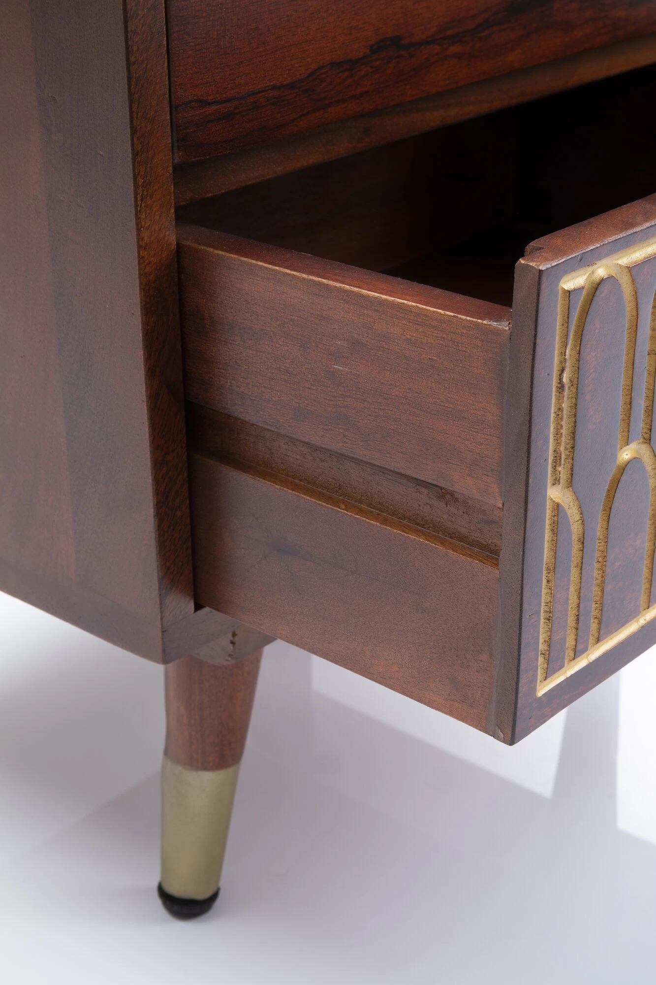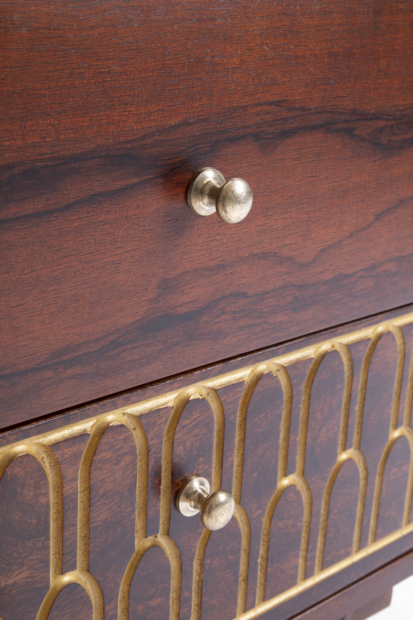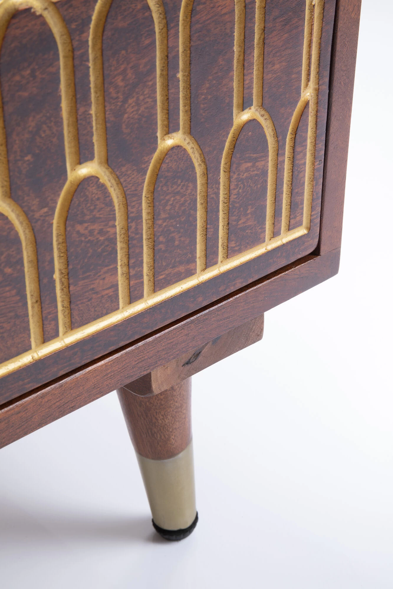 - Handgefertigte, kleine Kommode aus Mango-Massivholz mit eingravierten, orientalischen Gold-Verzierungen und zwei Schüben