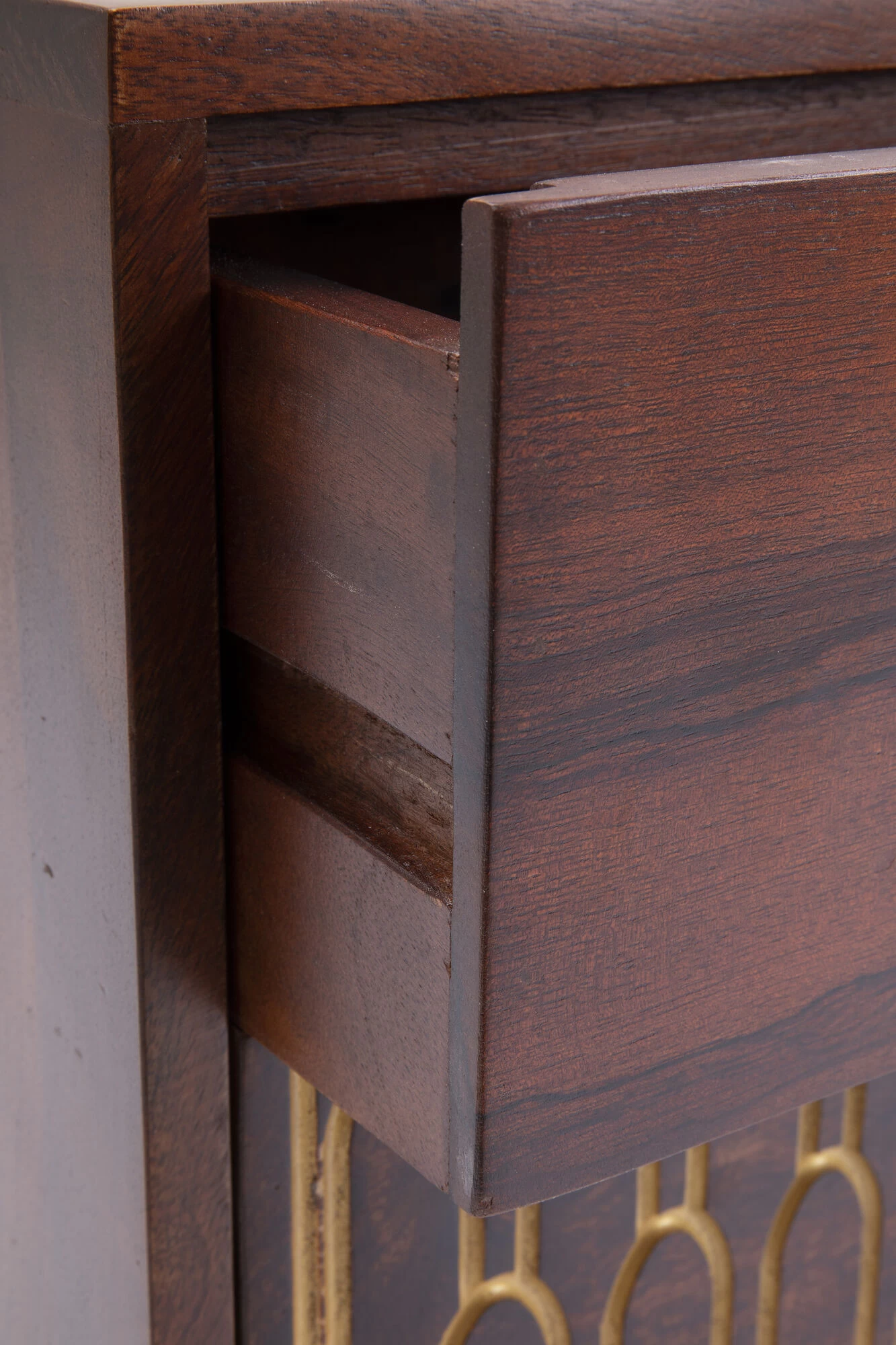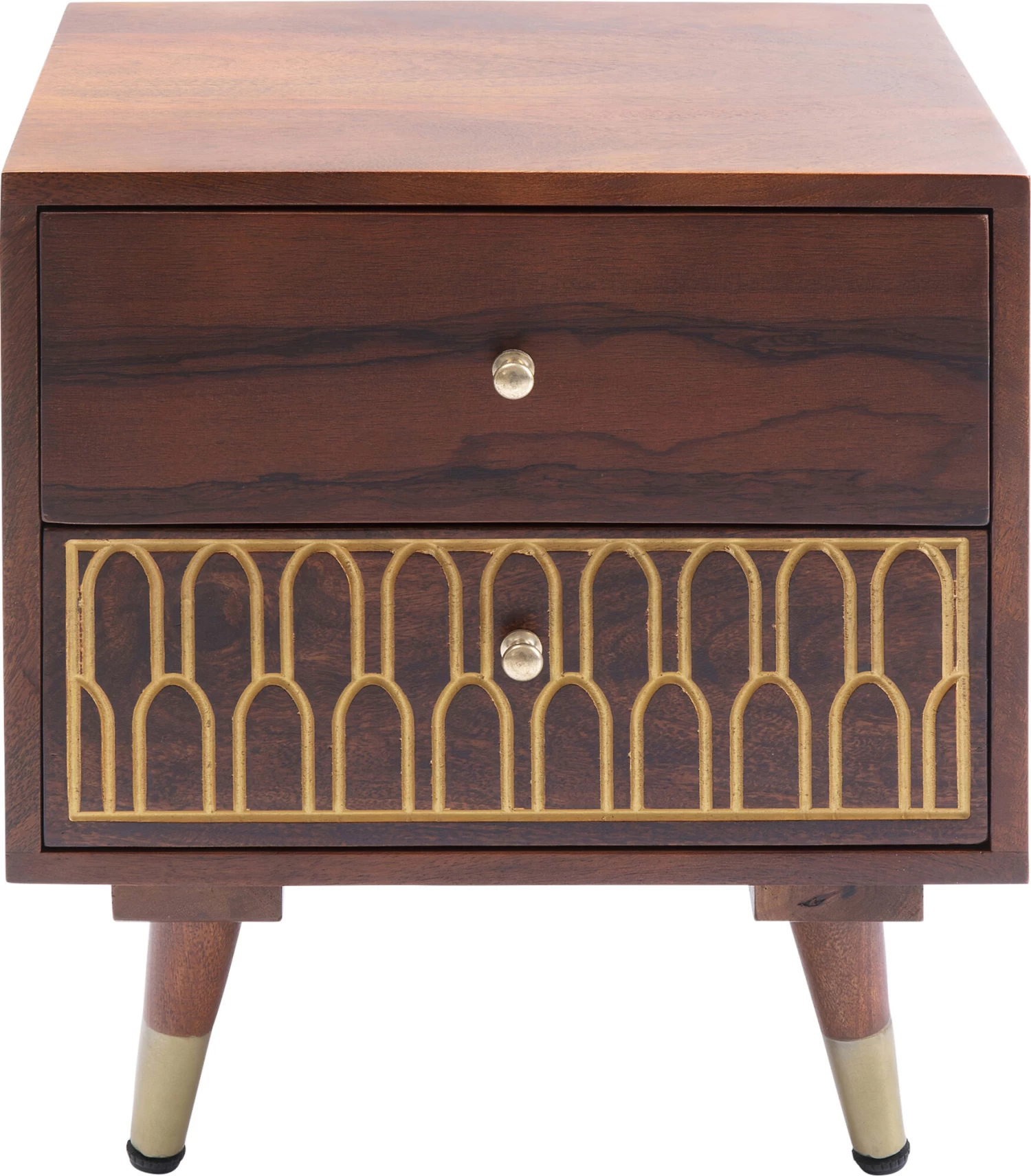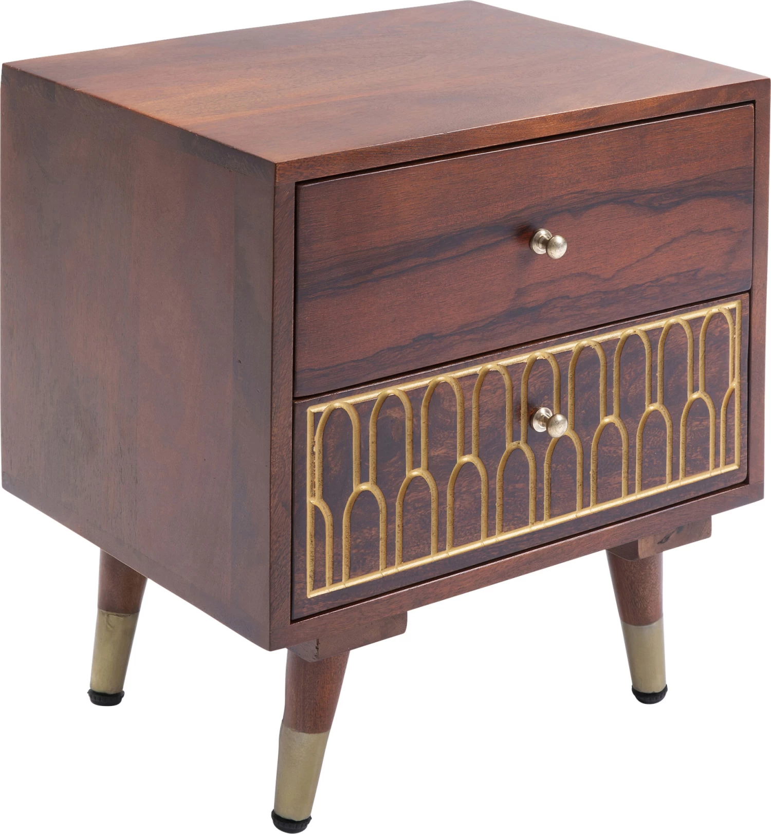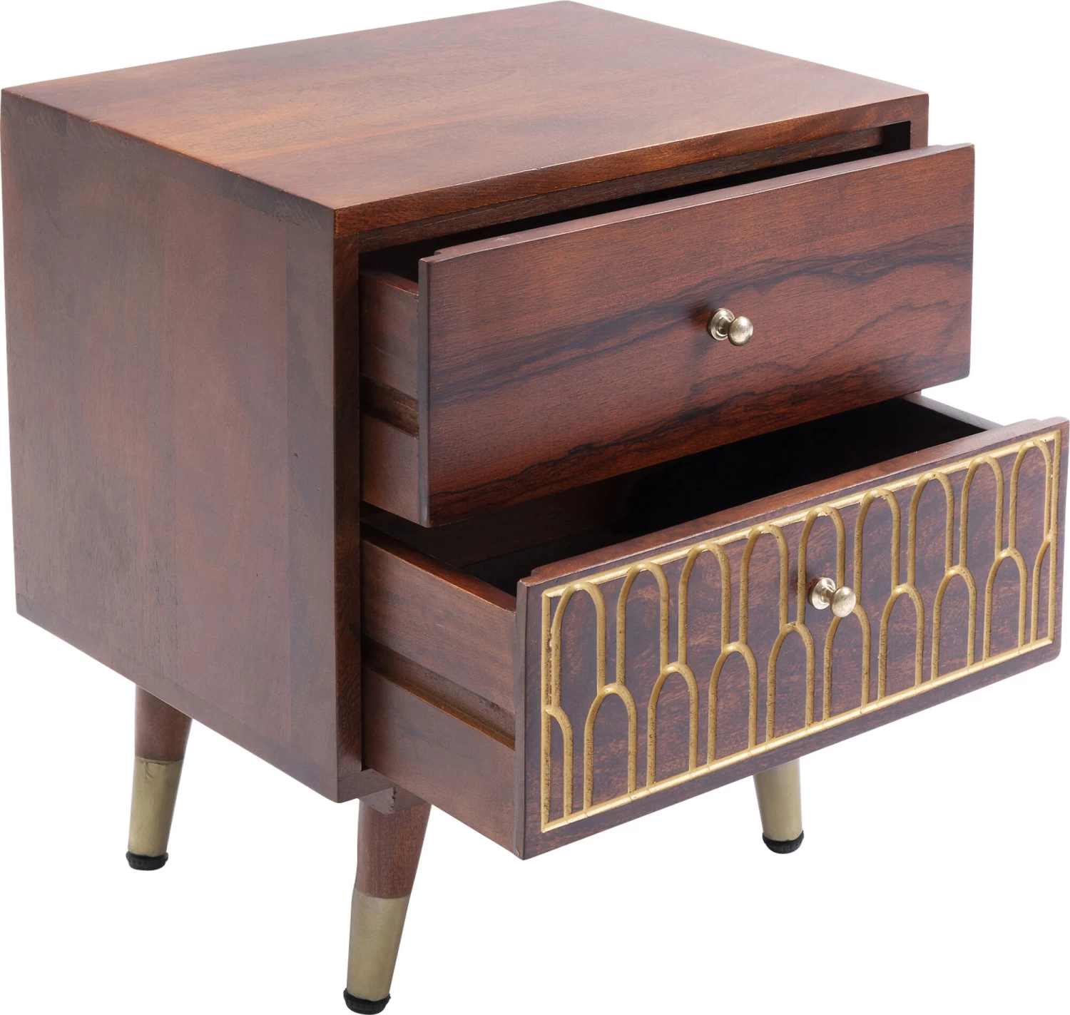 - Handgefertigte, kleine Kommode aus Mango-Massivholz mit eingravierten, orientalischen Gold-Verzierungen und zwei Schüben