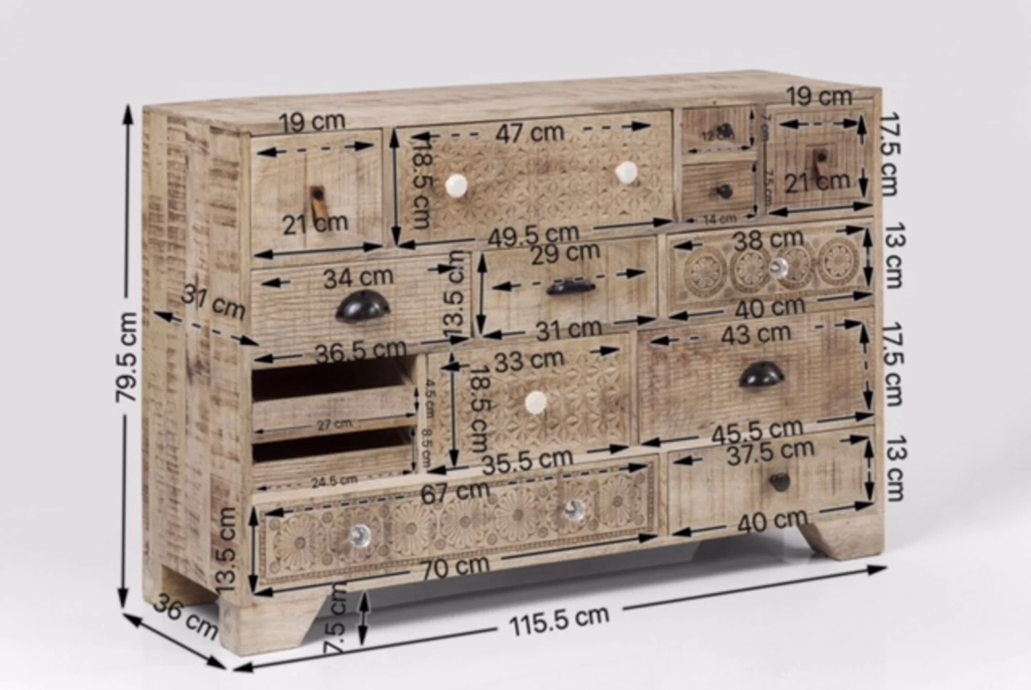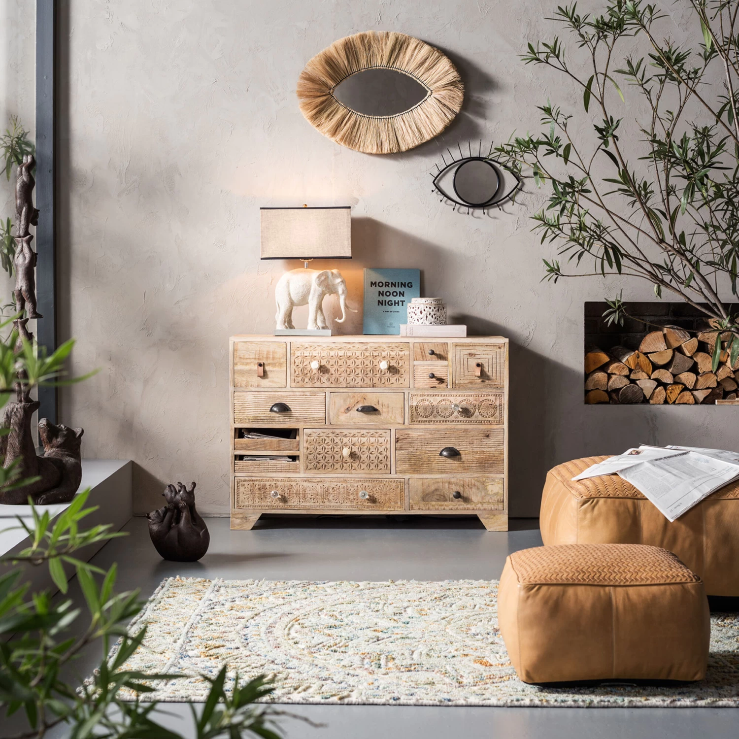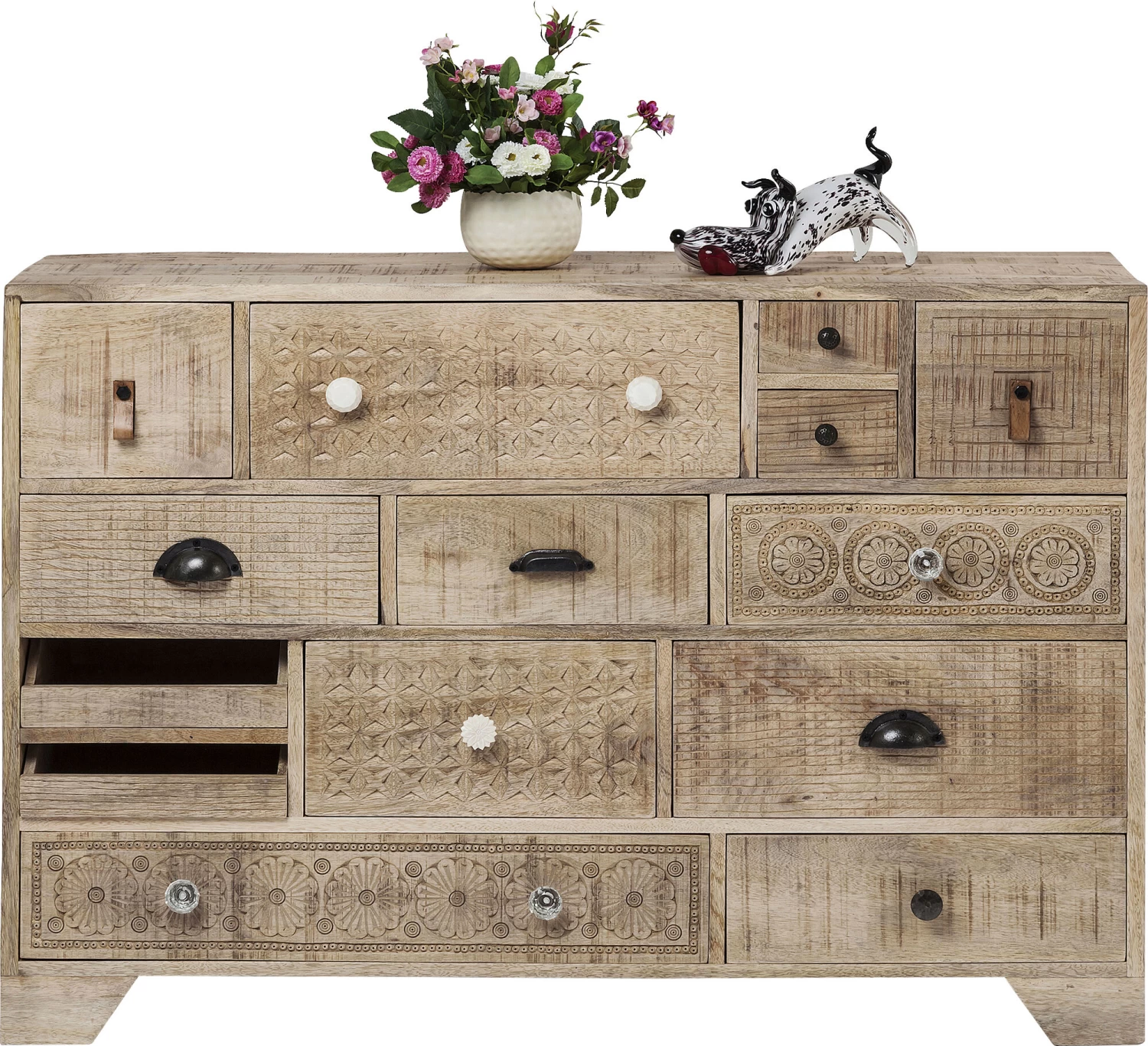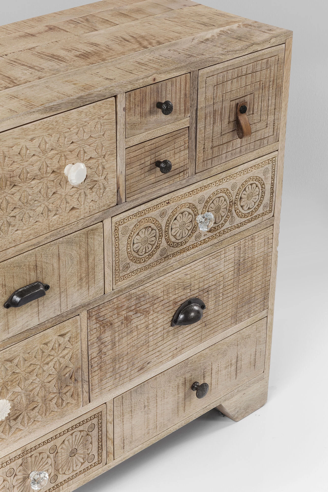 - Handgefertigte Kommode aus Mango-Massivholz mit dekorativen Schnitzereien und 14 individuellen Schüben
