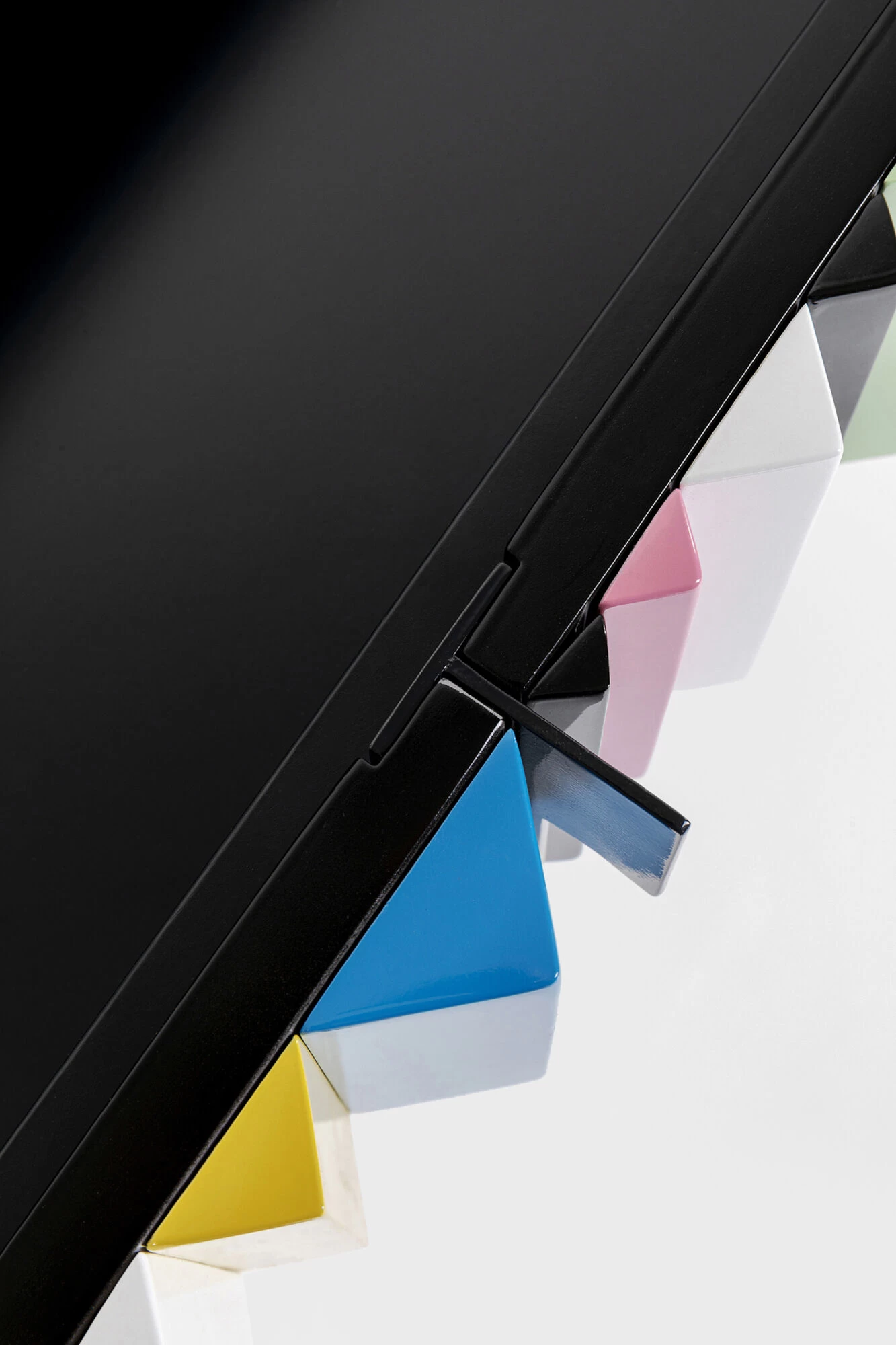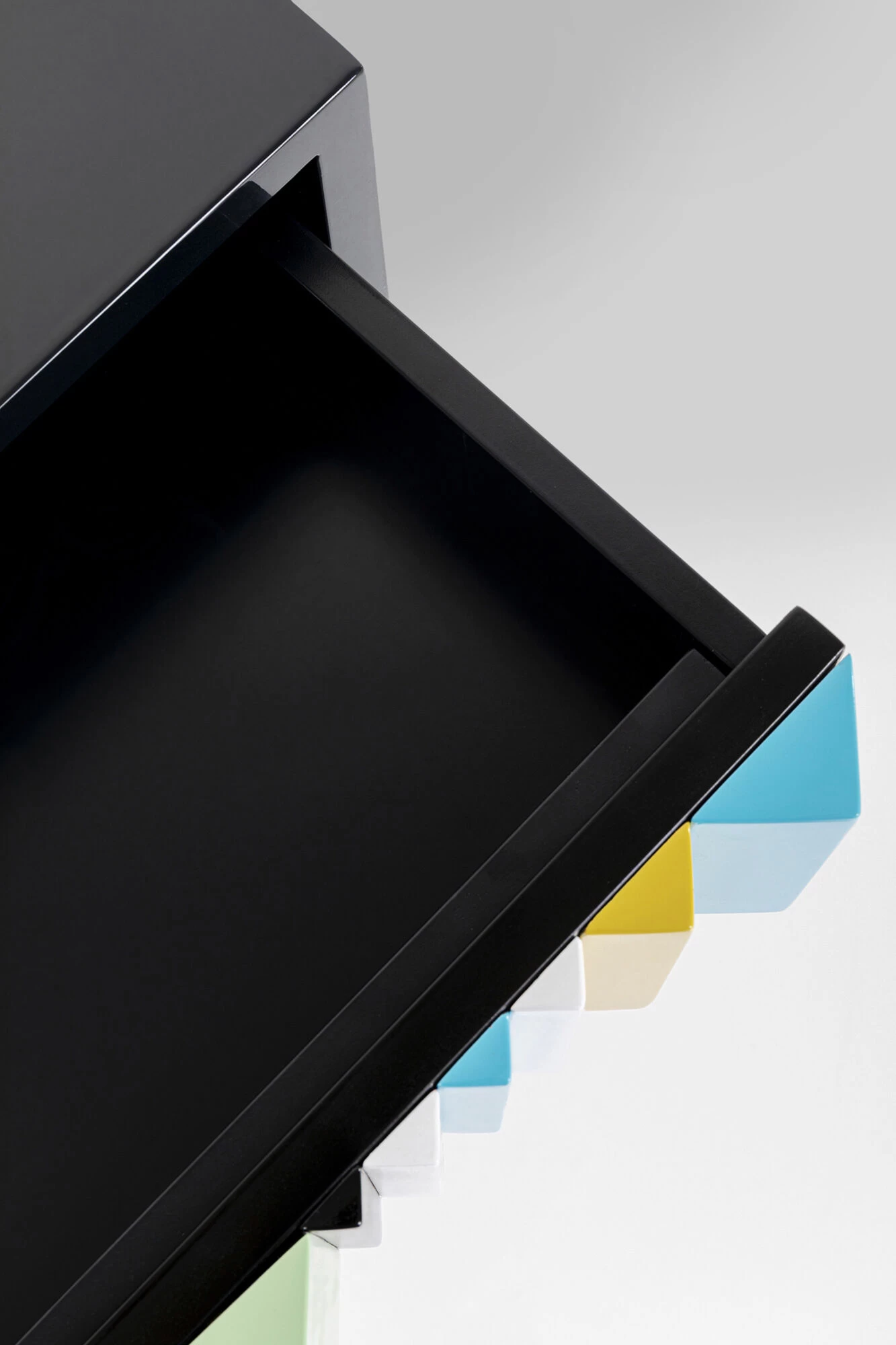 - Zwei Schubladen mit plastischen Fronten und schmalen, schwarzen Griffleisten aus lackiertem Stahl