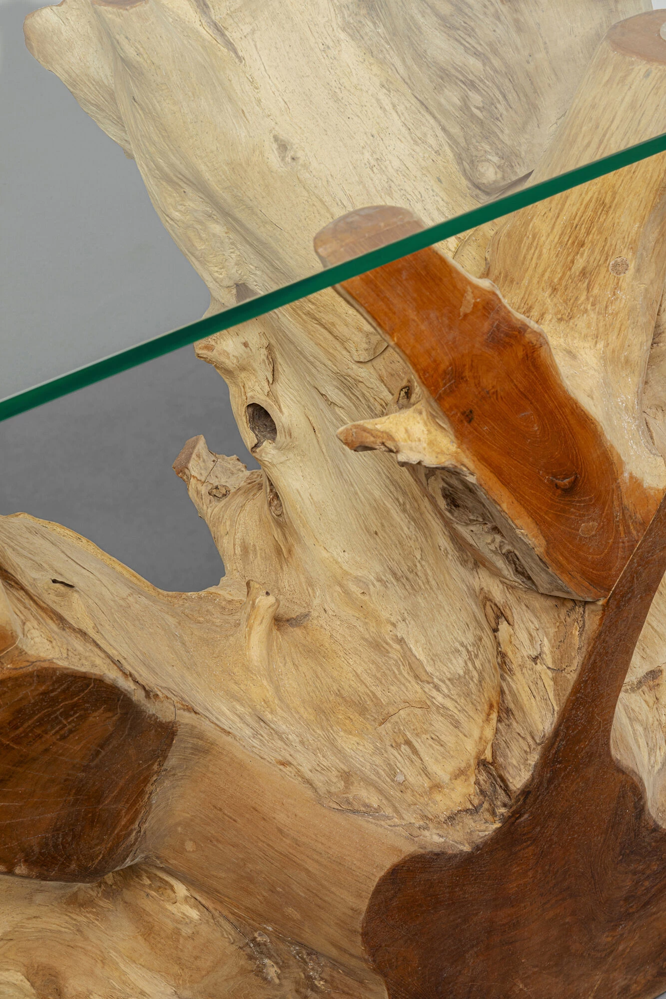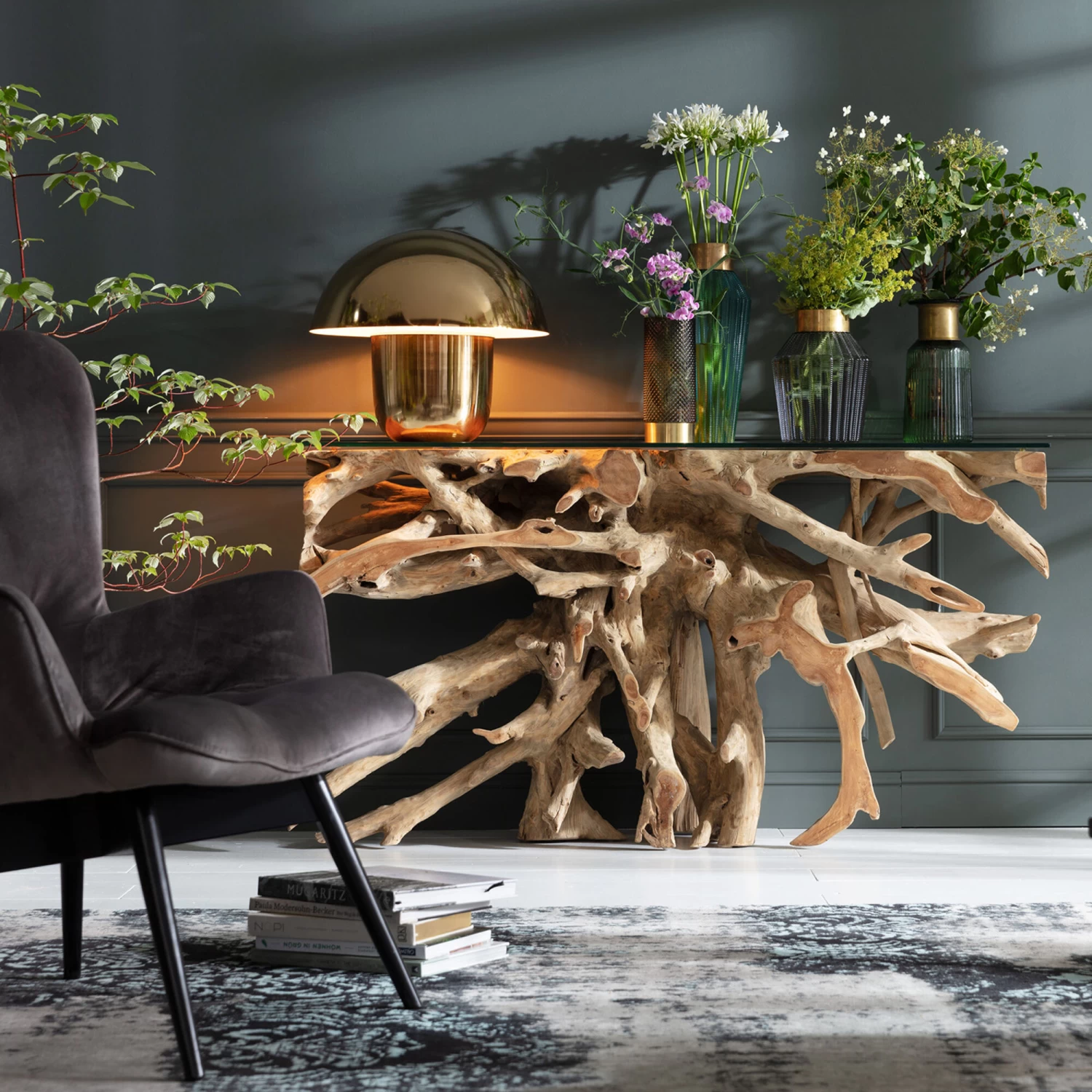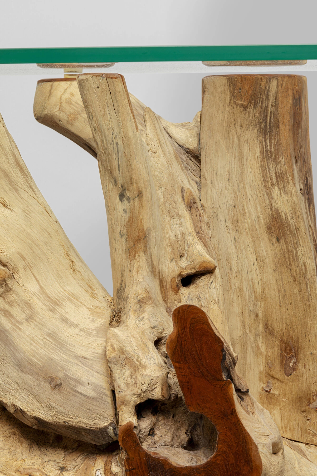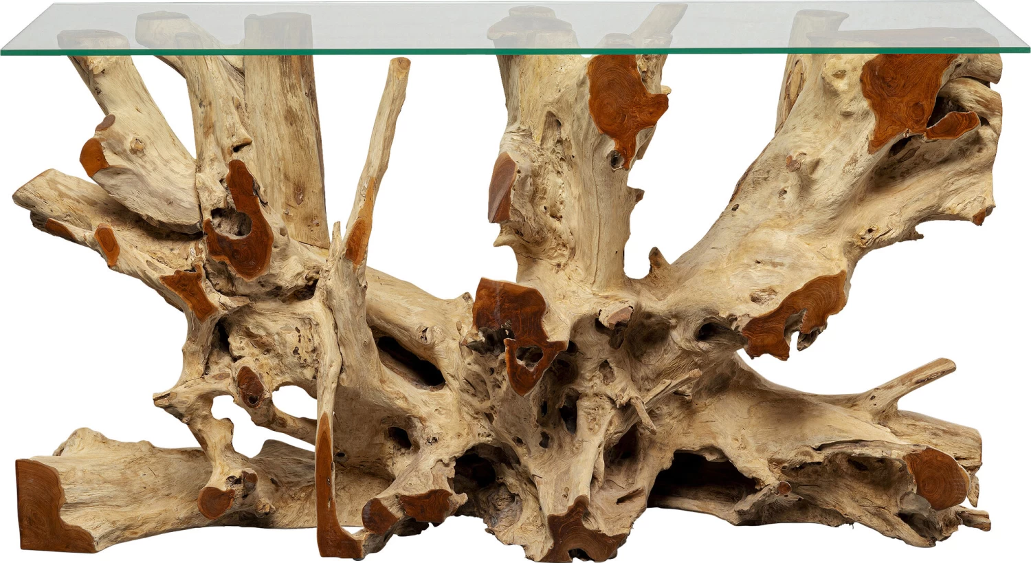 - Das Wurzelgestell und die Glasplatte als konträre Kombi machen den Konsolentisch zum Showpiece im Flur oder Wohnzimmer