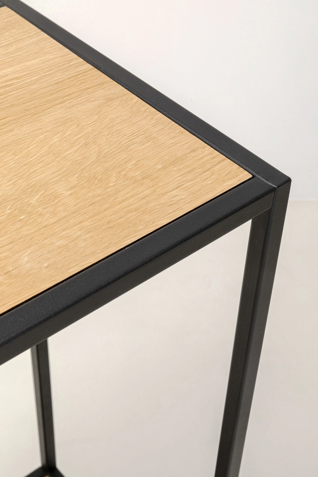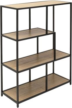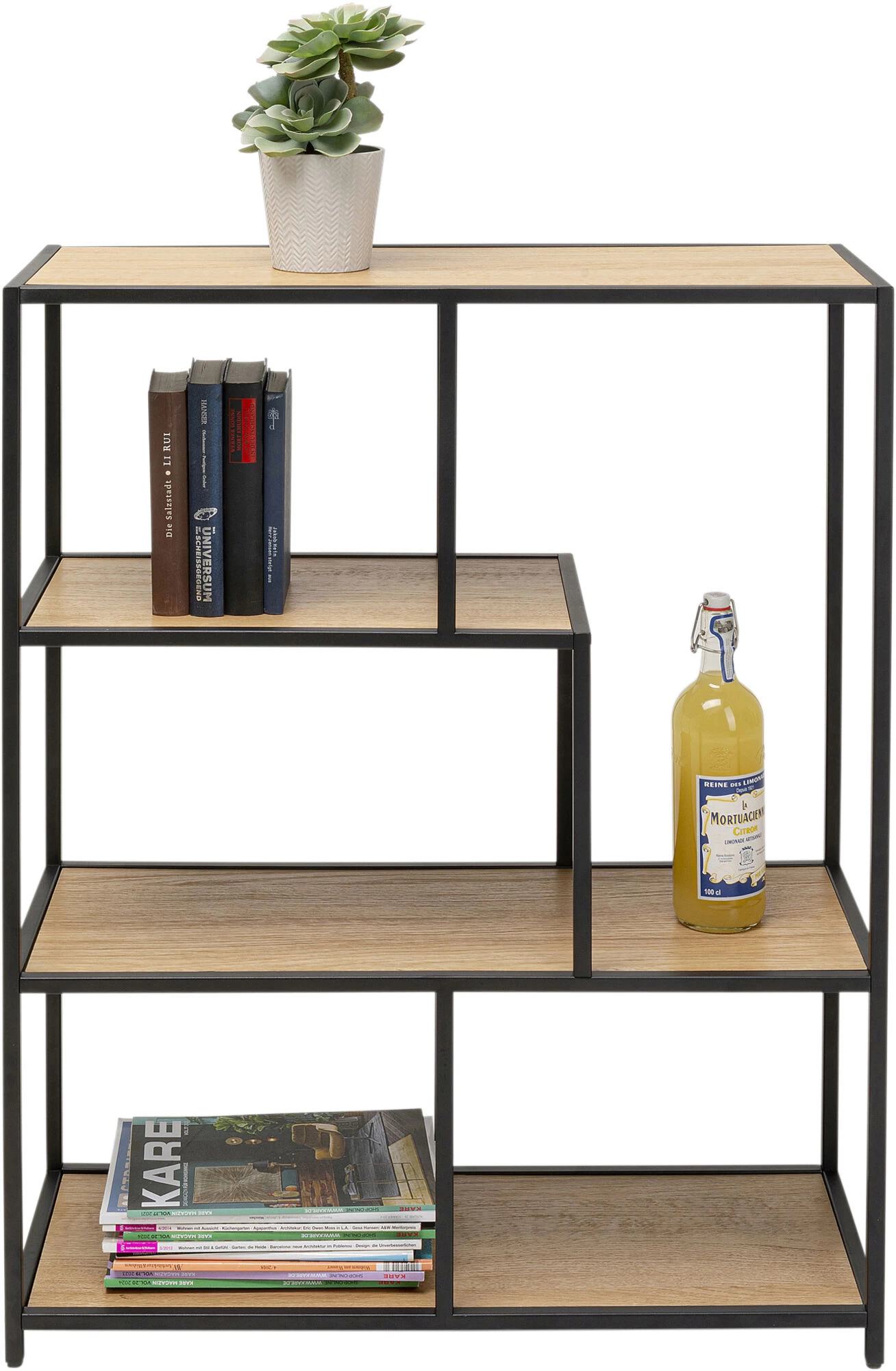 - Niedriges Regal aus schwarzem Metall mit hellbrauen Holzböden, 100 x 77 x 30 Zentimeter (H/B/T)