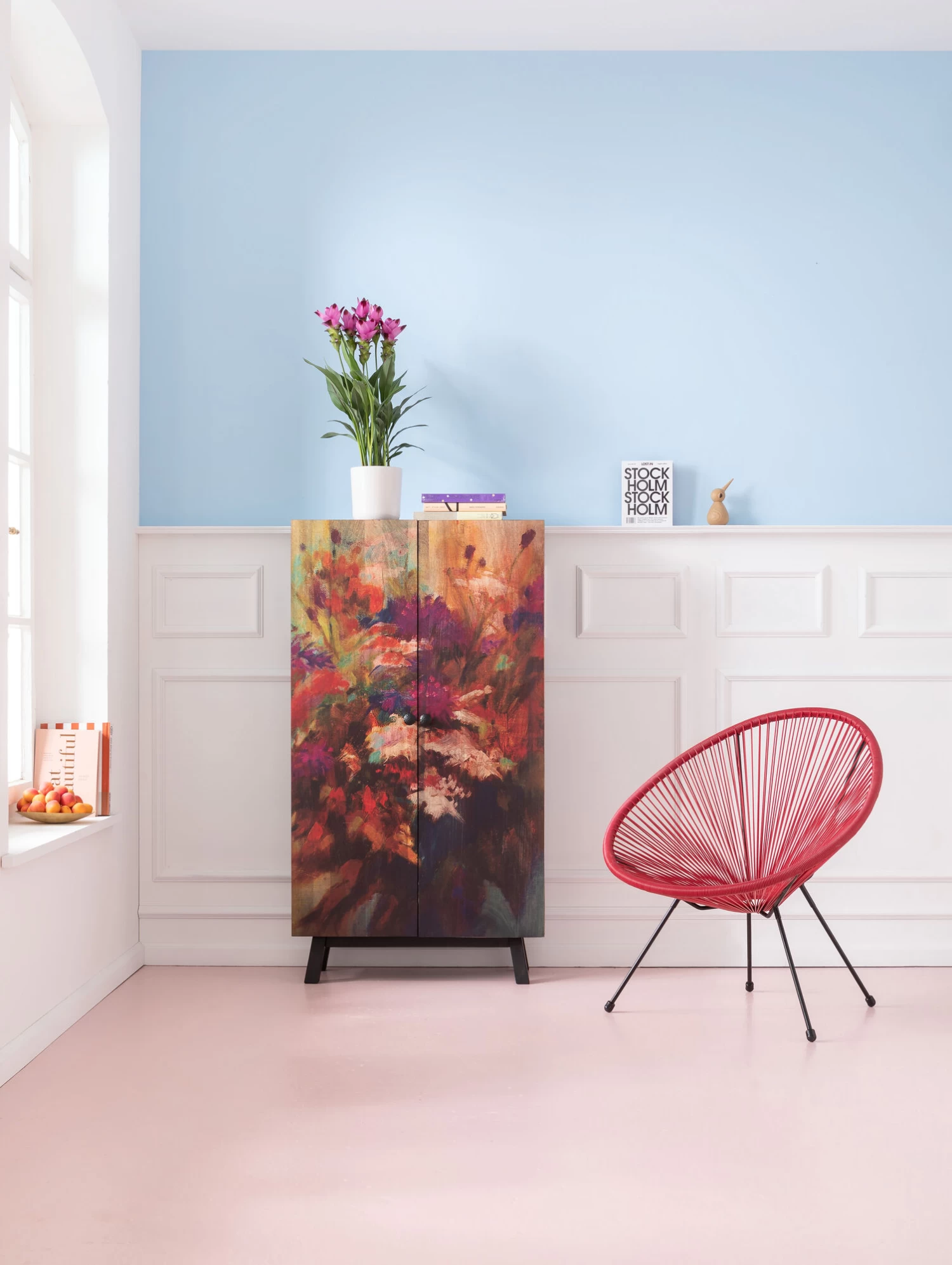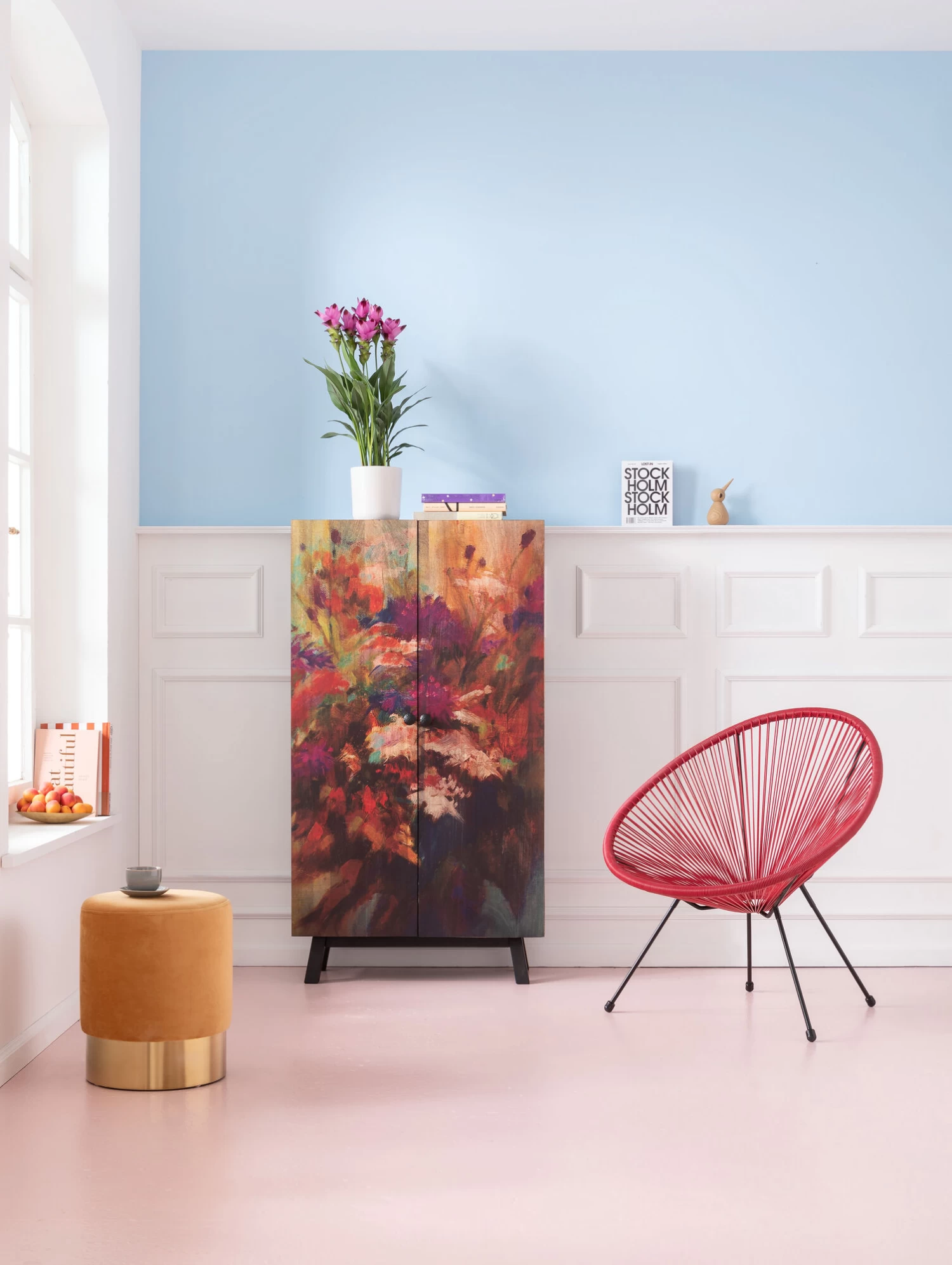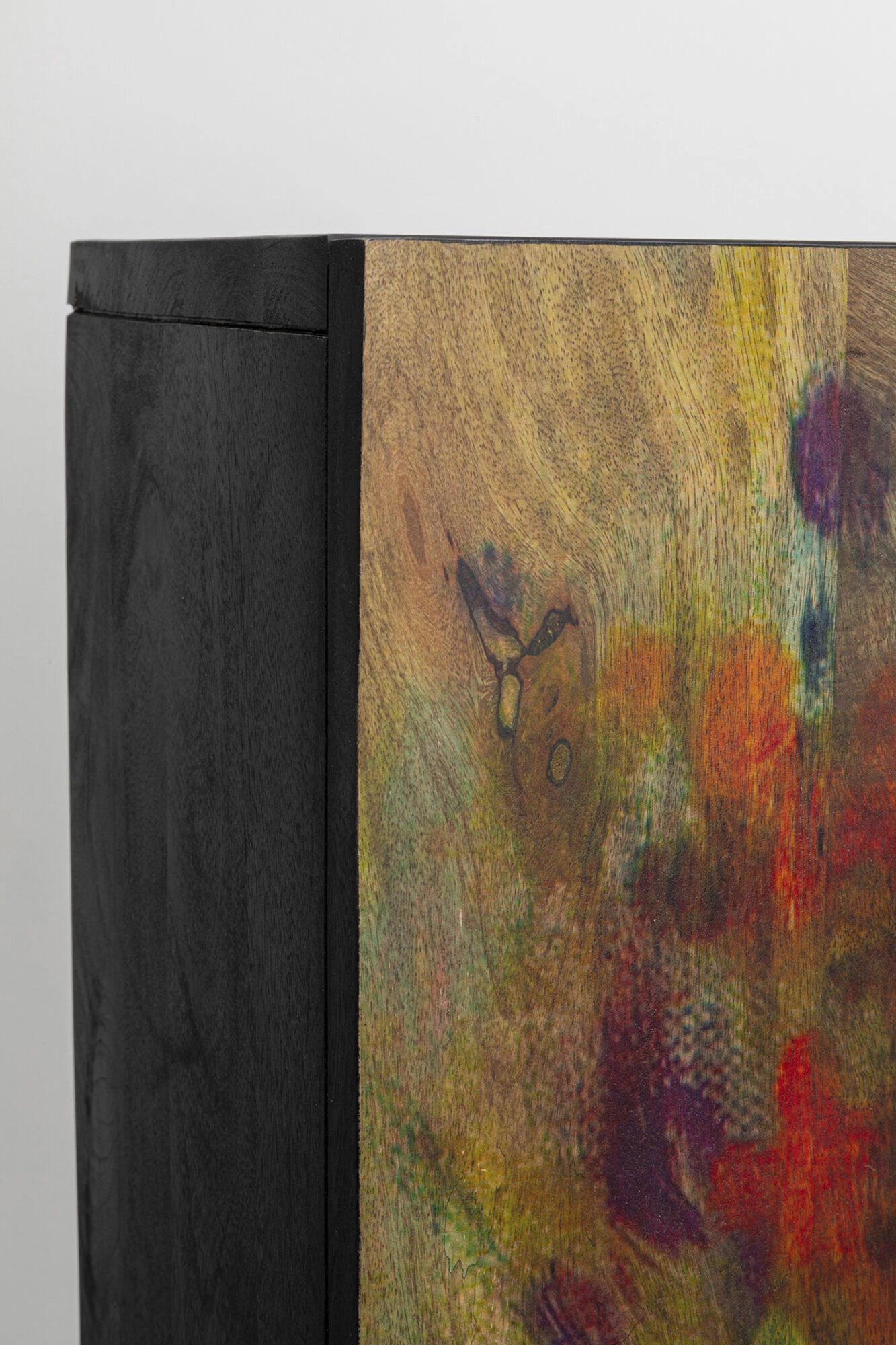 - Florale Motive und fantasievolle Pflanzenwelten verleihen dem Holzschrank eine poetische, fast träumerische Note