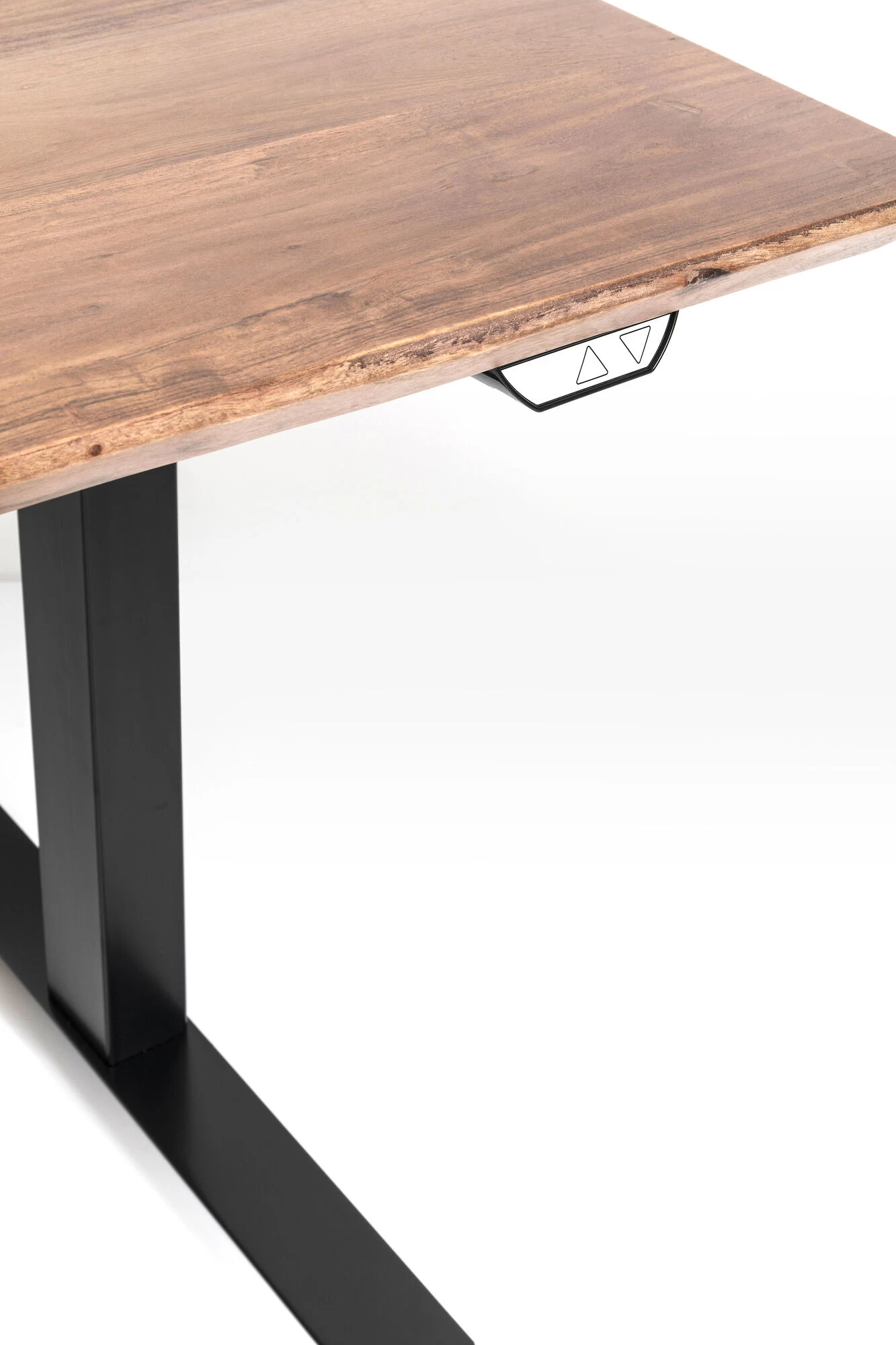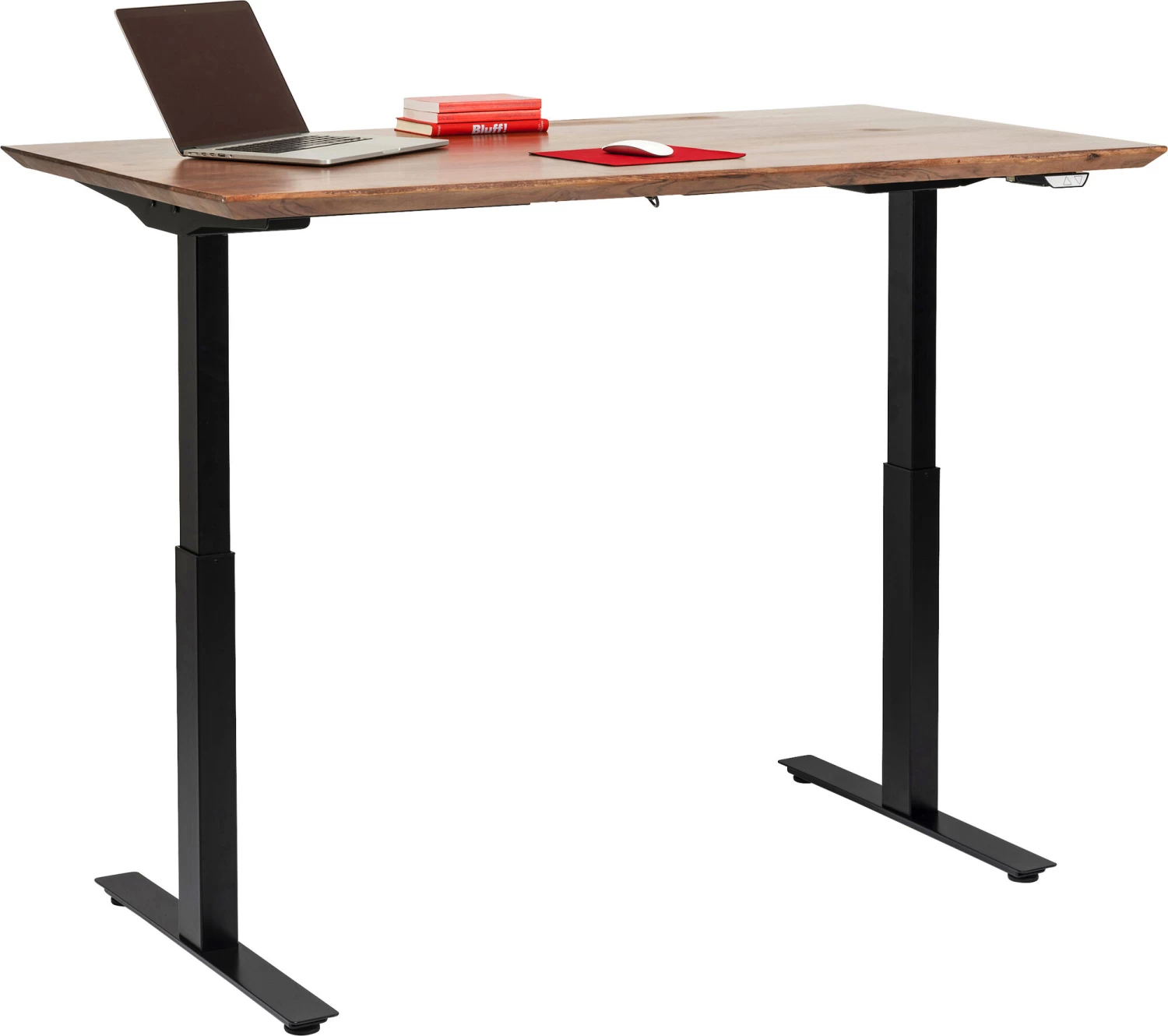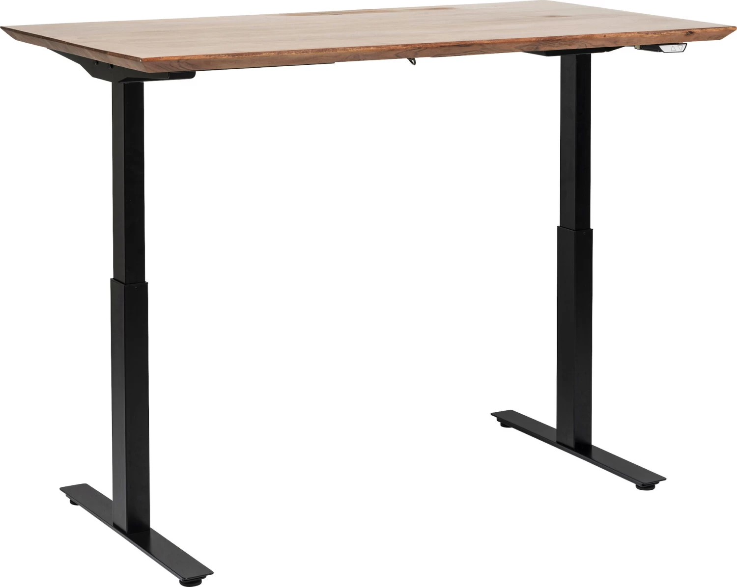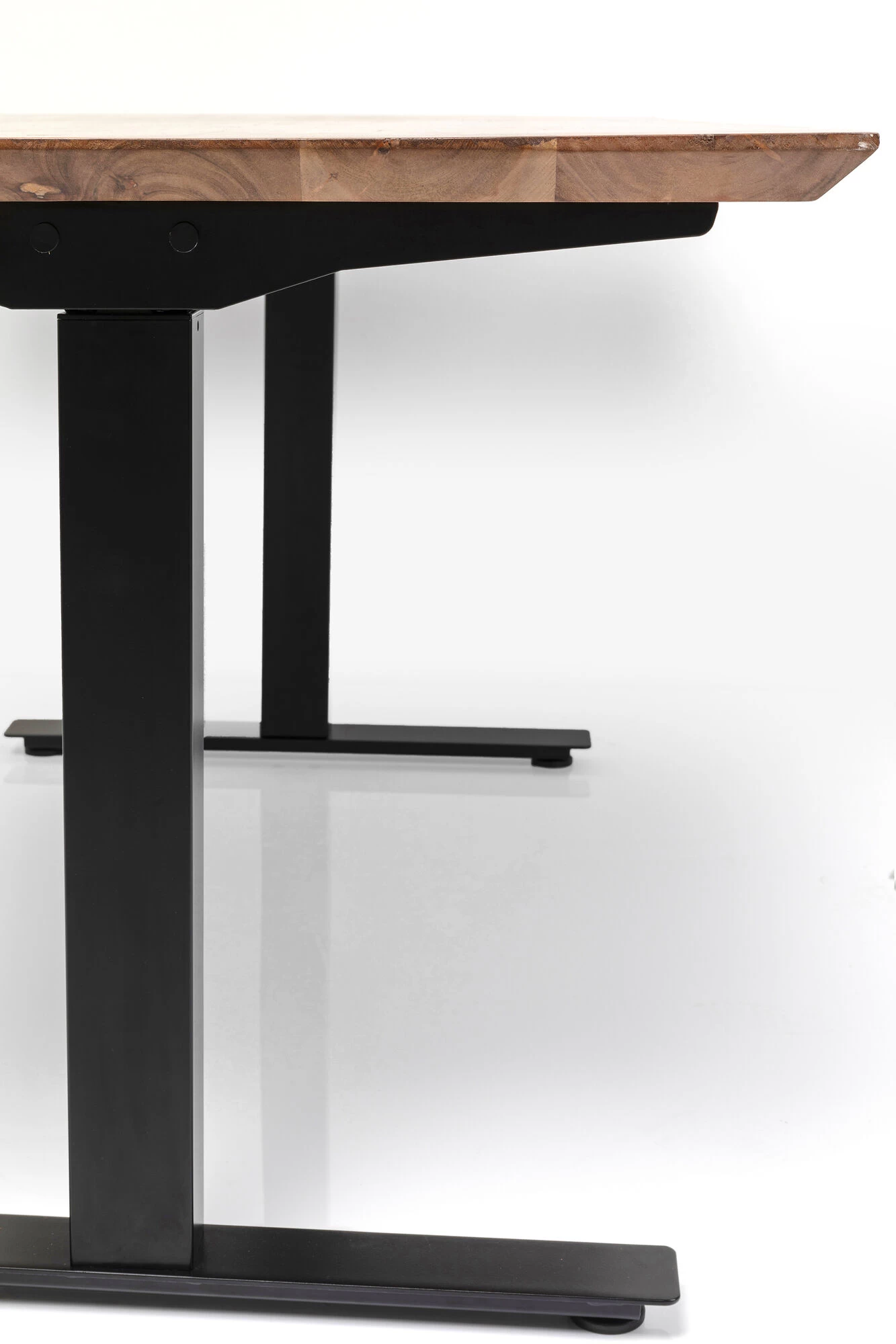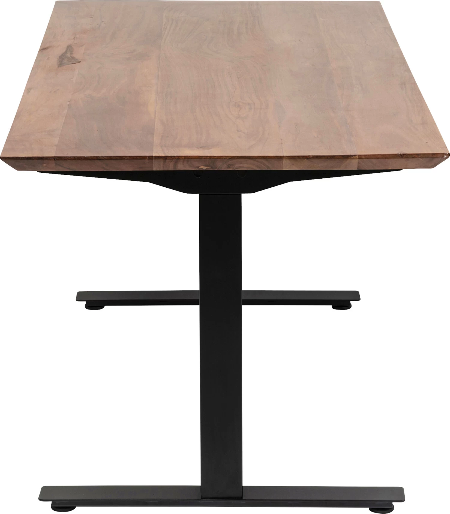 - Rechteckiger, elektrisch höhenverstellbarer Schreibtisch mit handgefertigter 3,5 cm starker Akazienholz-Platte und lackierten Stahl-Kufen in Schwarz