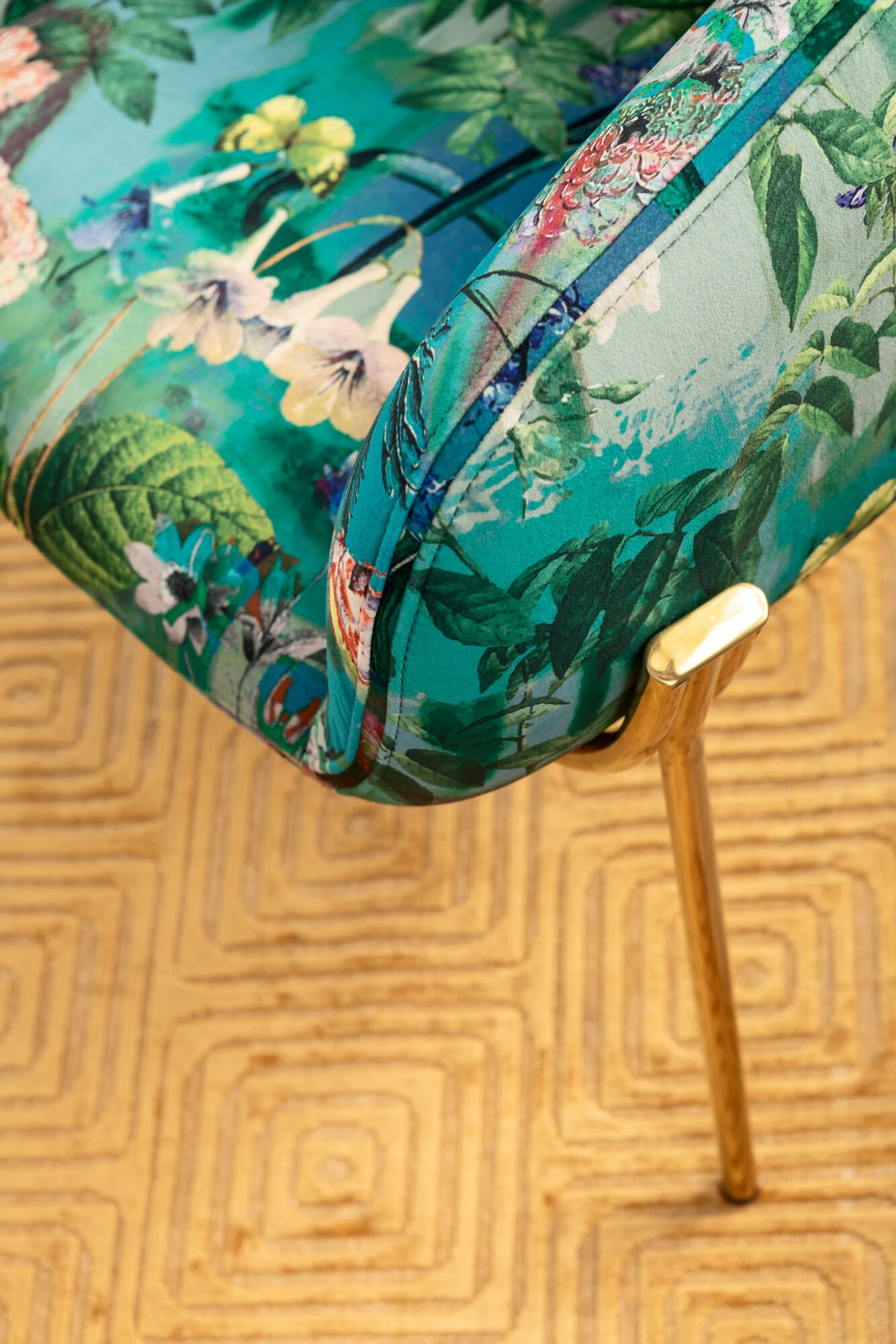 - Gemusterter Cocktail Sessel mit zierlichem goldfarbenen Gestell und Beinen und komfortabel gepolsterten, durchgehenden Arm- und Rückenlehnen