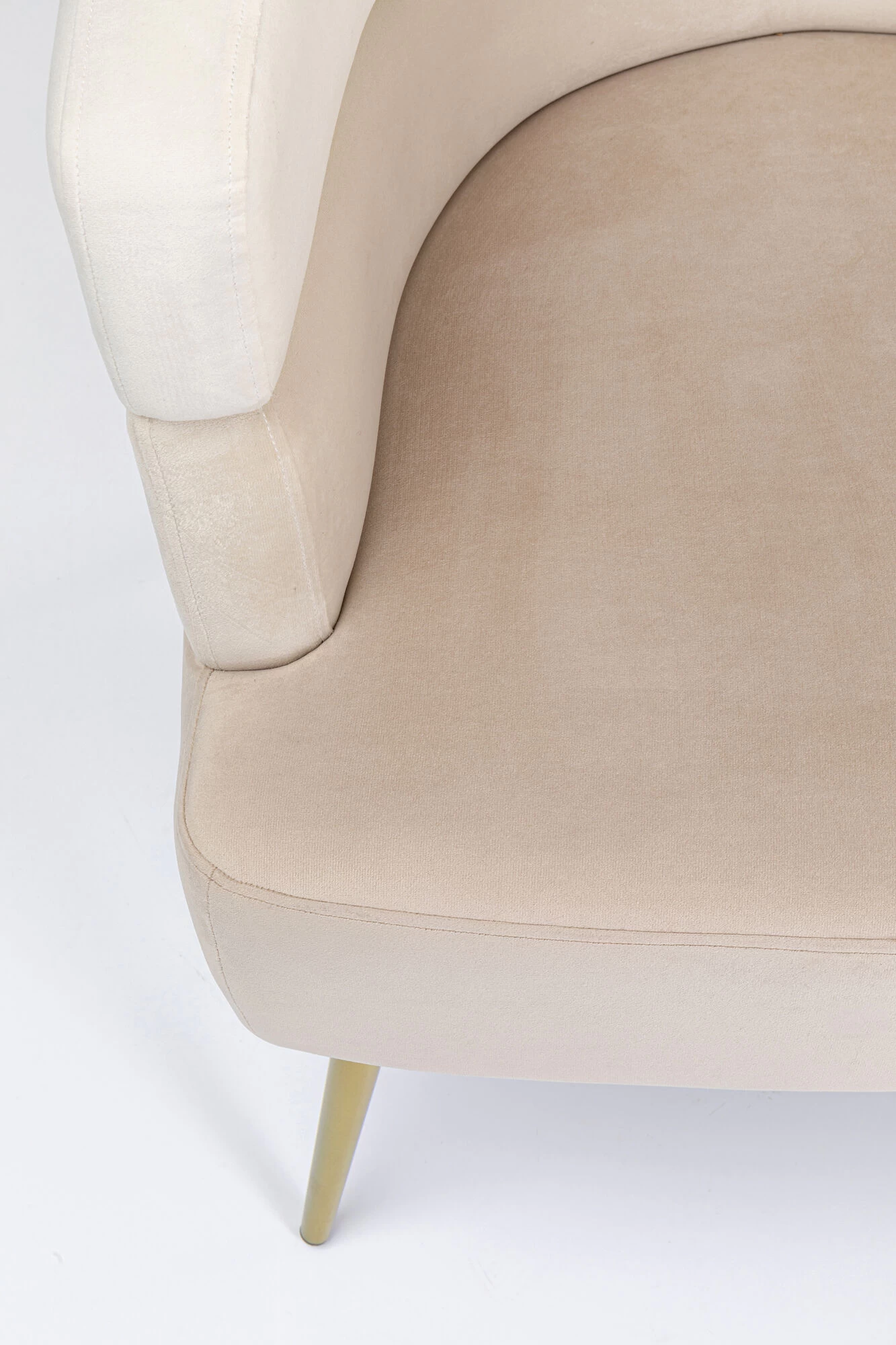 - Die drei abgestuften Cremetöne der samtigen Polster und die zweigeteilte Rückenlehne sorgen für einen hohen Designfaktor