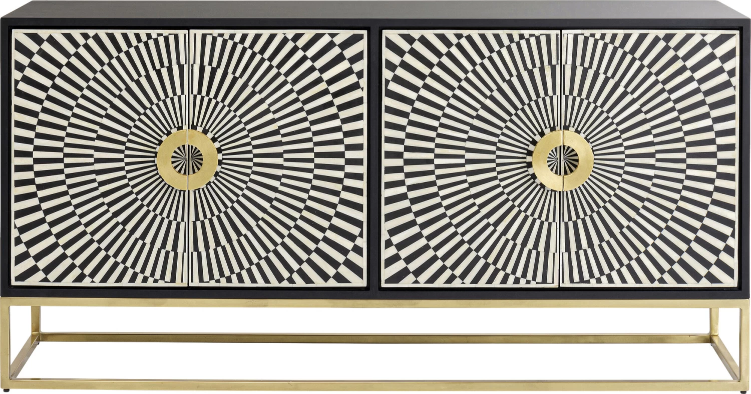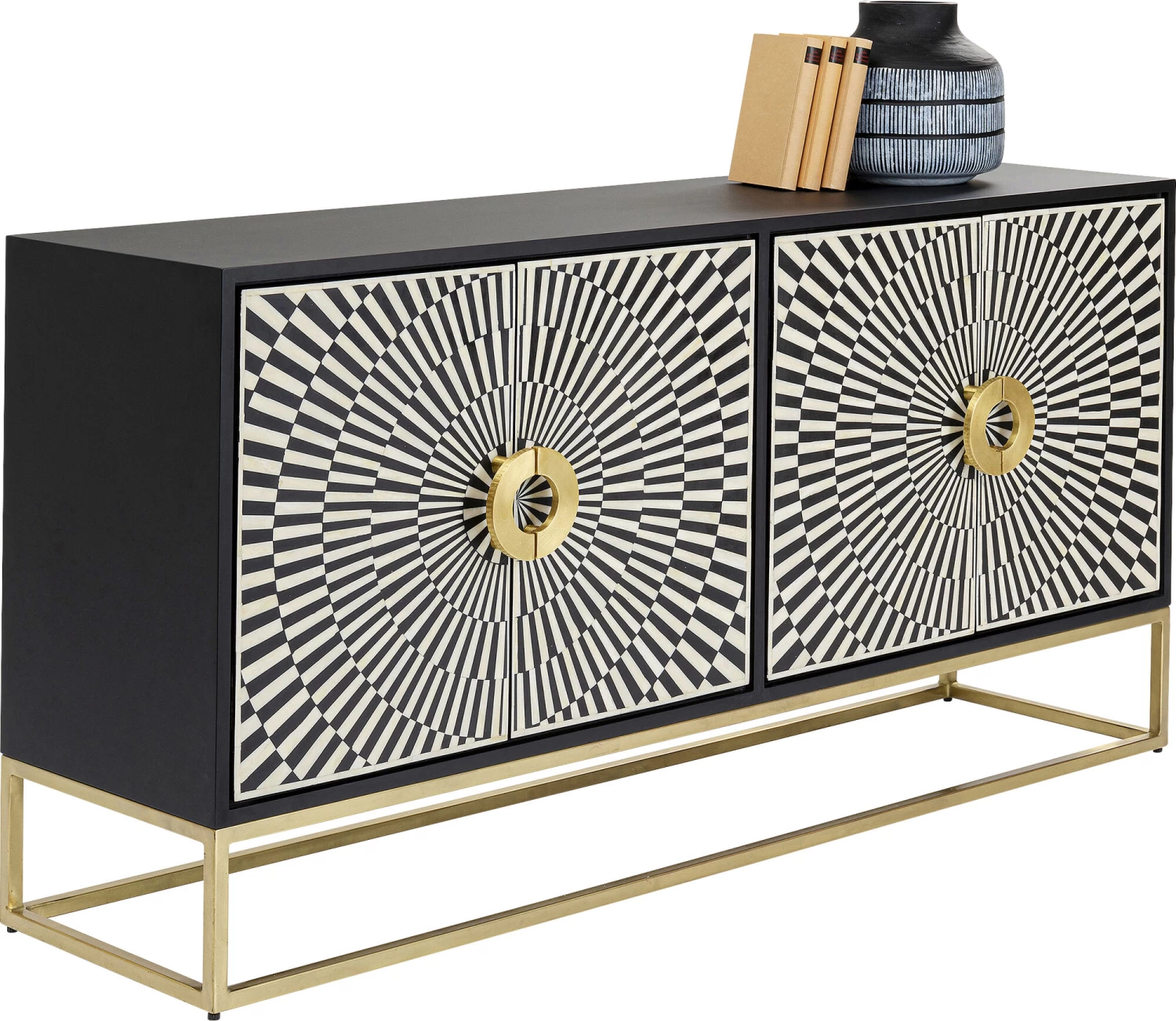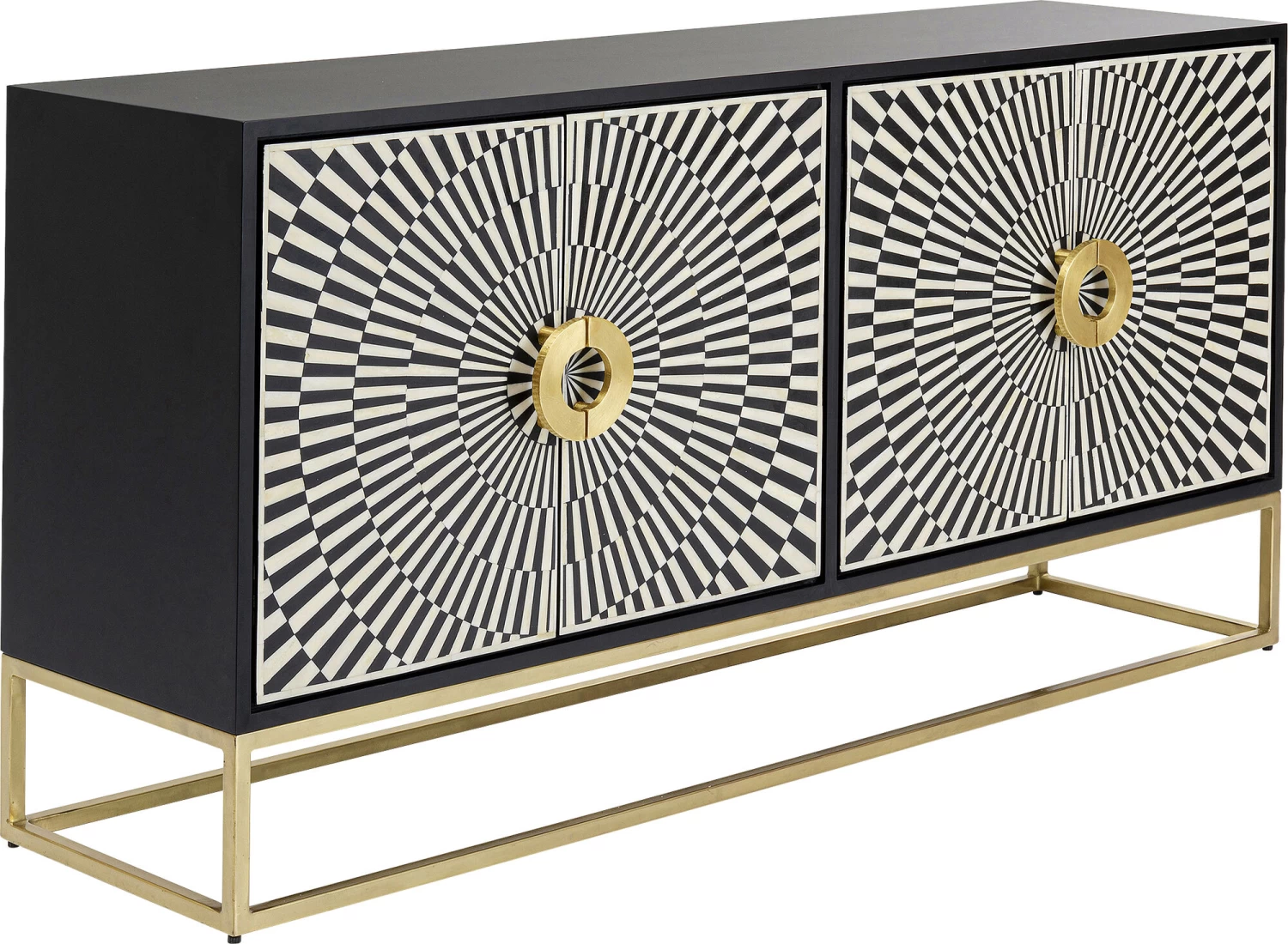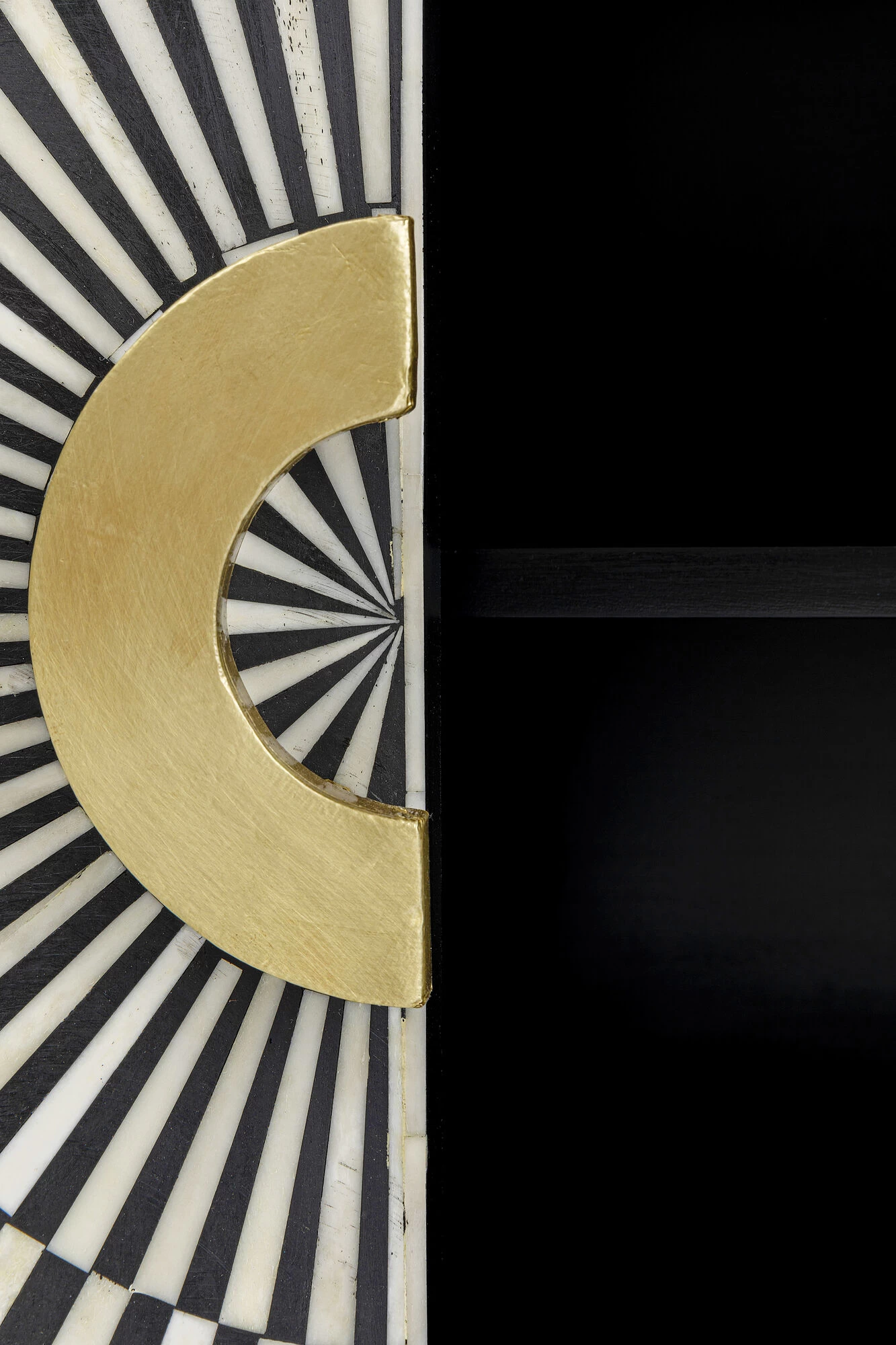 - Die Türfronten sind mit Intarsienarbeiten in Schwarz und Weiß in bester Handwerkstradition gearbeitet. Das kreisförmige Muster zieht magisch alle Blicke auf sich