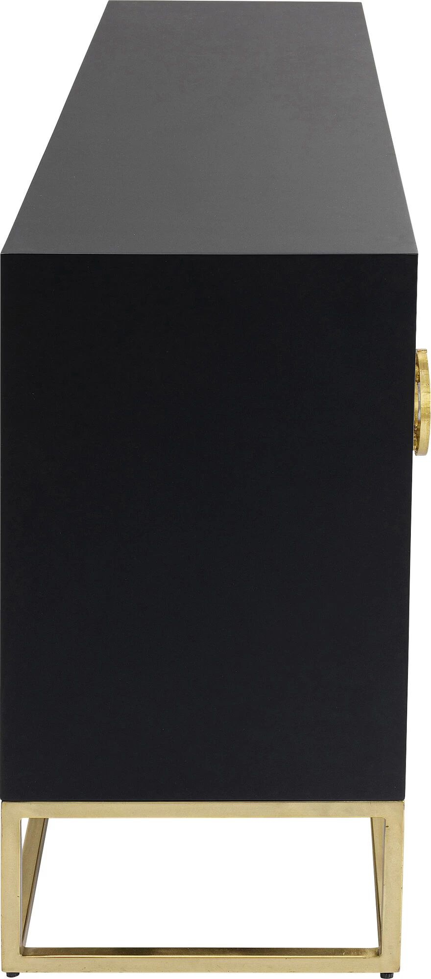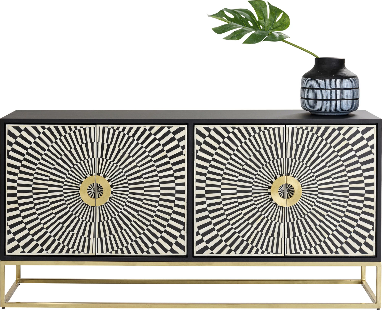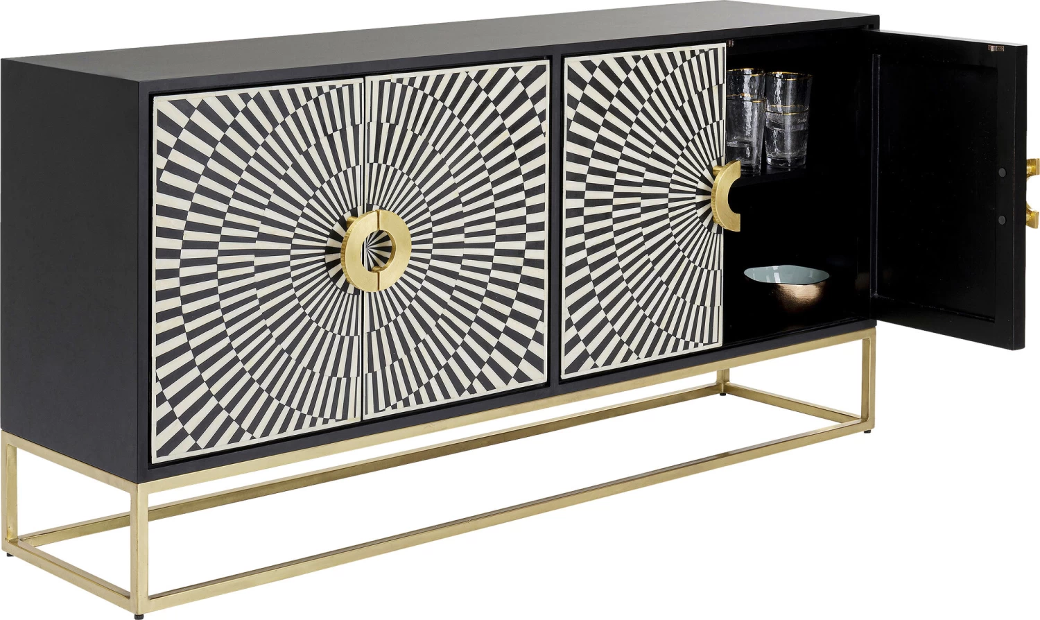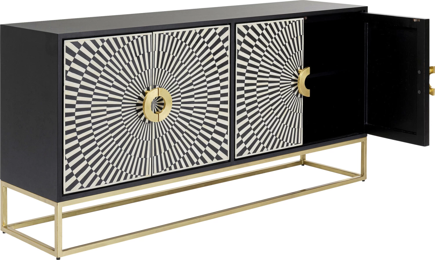 - Die Türfronten sind mit Intarsienarbeiten in Schwarz und Weiß in bester Handwerkstradition gearbeitet. Das kreisförmige Muster zieht magisch alle Blicke auf sich