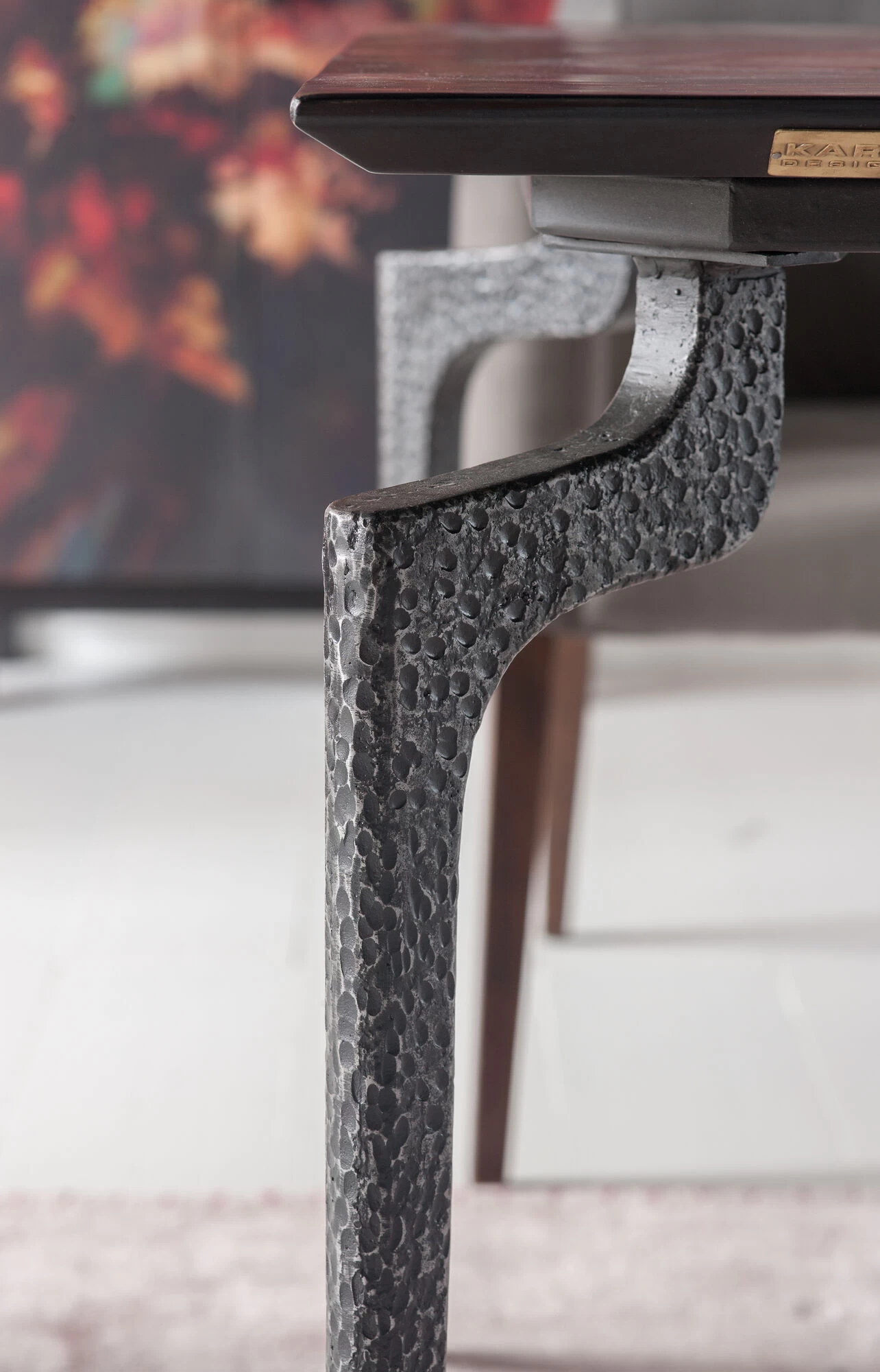 - Einzigartig: Die raffiniert geformten, gehämmerten Stahl-Beine und die schrägen Tisch-Kanten
