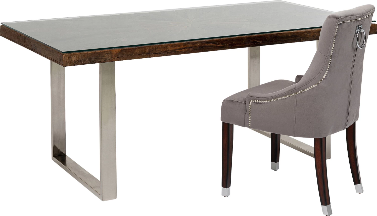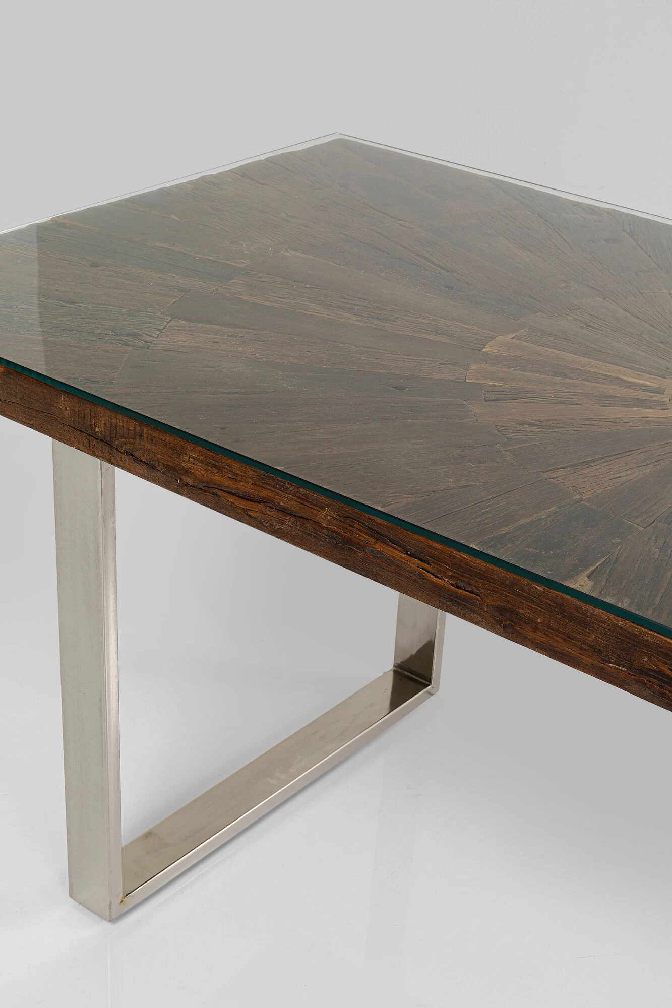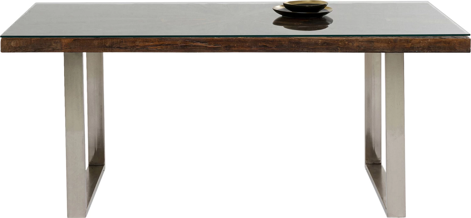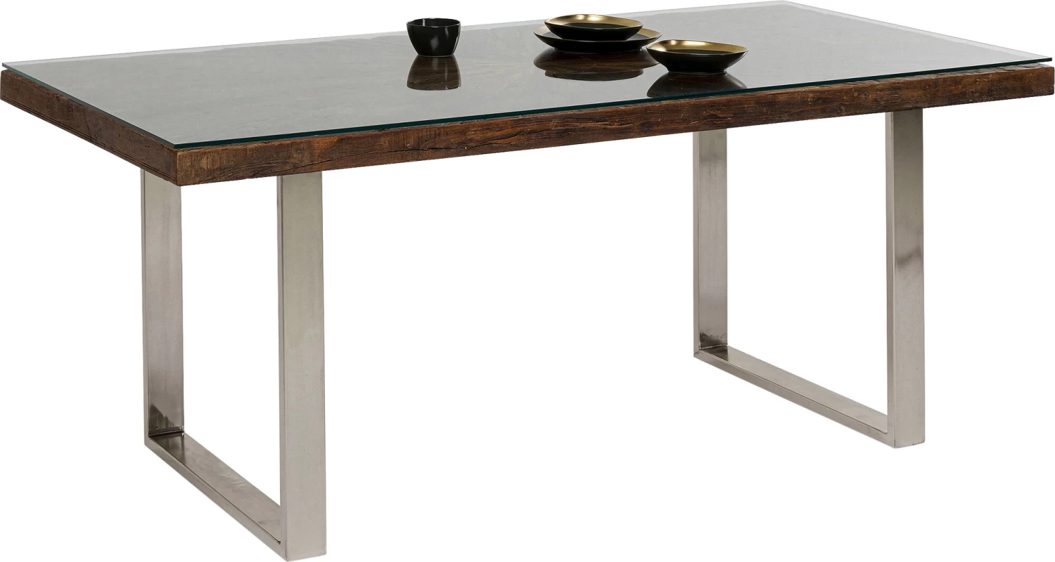 - Rechteckiger, dunkler Esstisch aus recyceltem Mango- und Akazienholz mit Glasplatte und verchromten Kufen
