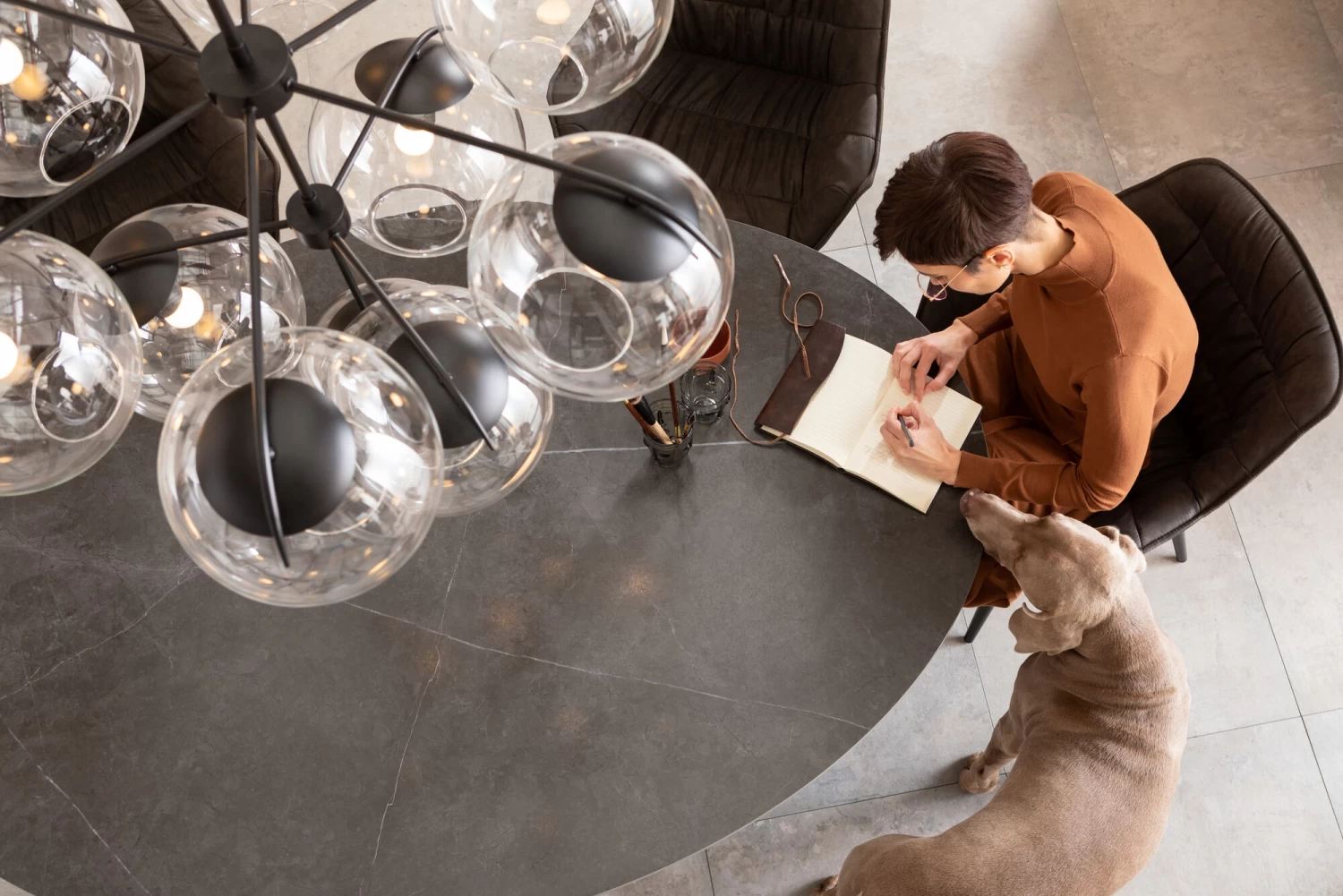 - Noble Tischplatte aus dunkler Keramik, Maserung und Optik erinnern an Naturstein