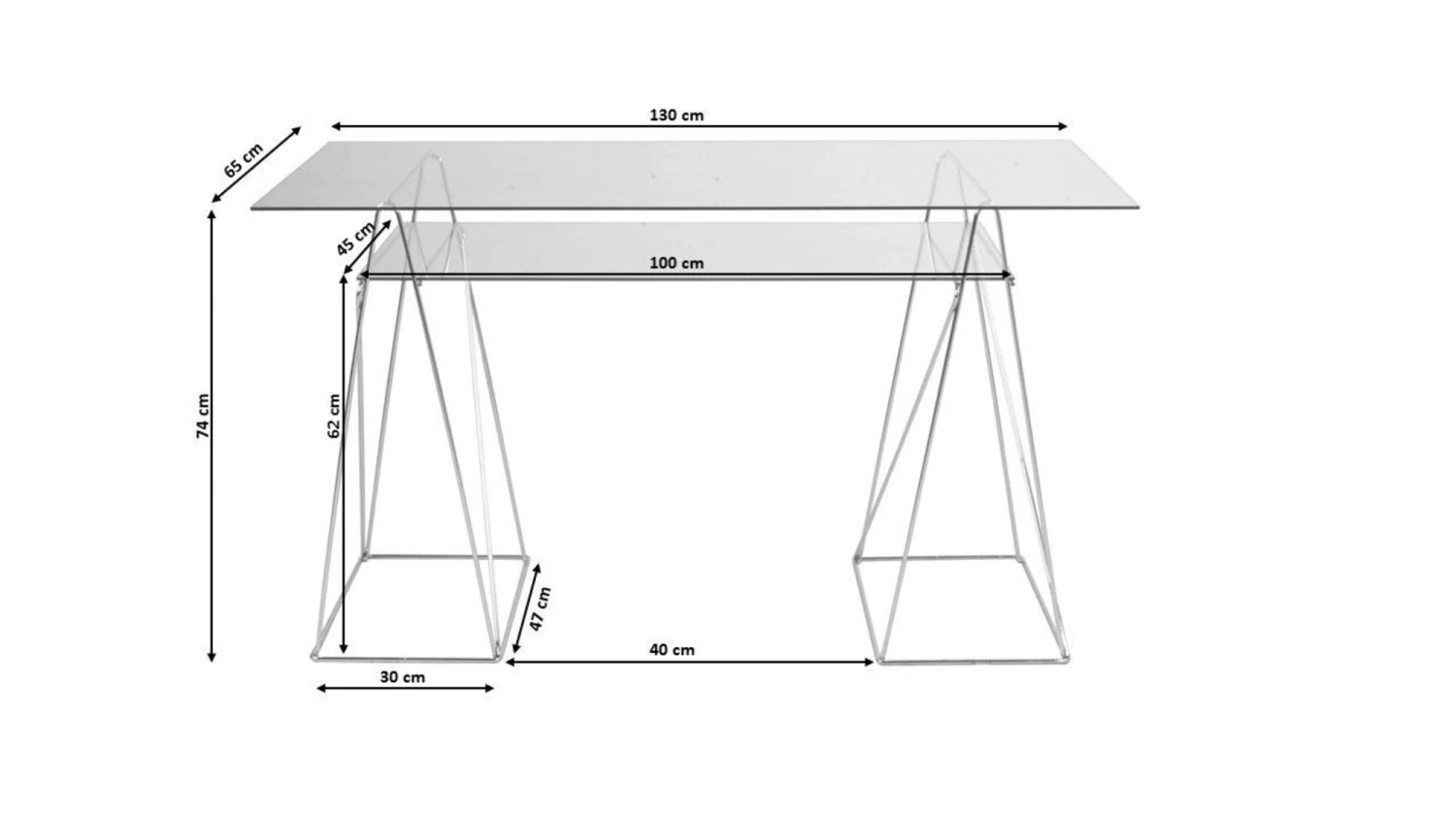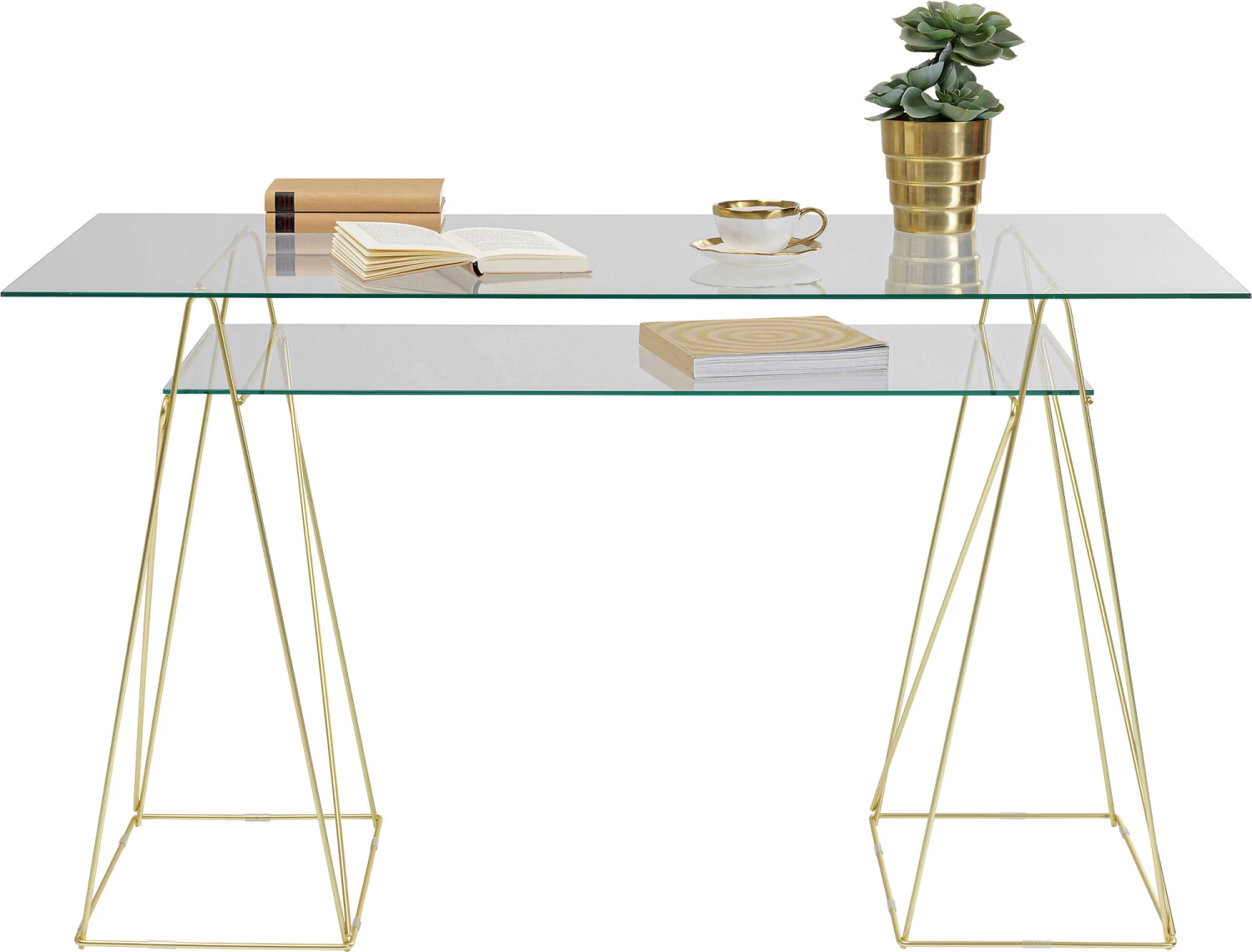 - Filigraner Glas-Schreibtisch mit stabilen Tischböcken aus Stahl und einer zusätzlichen Ablagefläche unter der Tischplatte