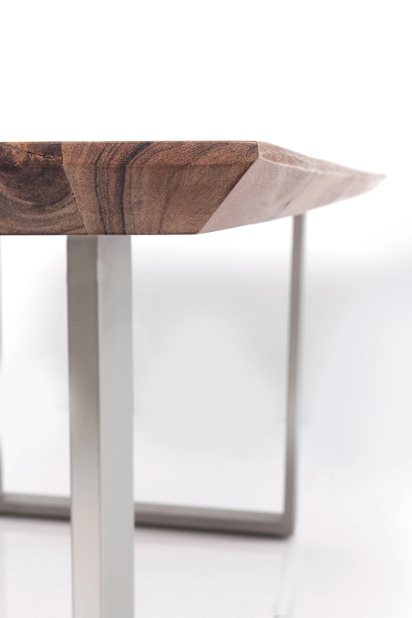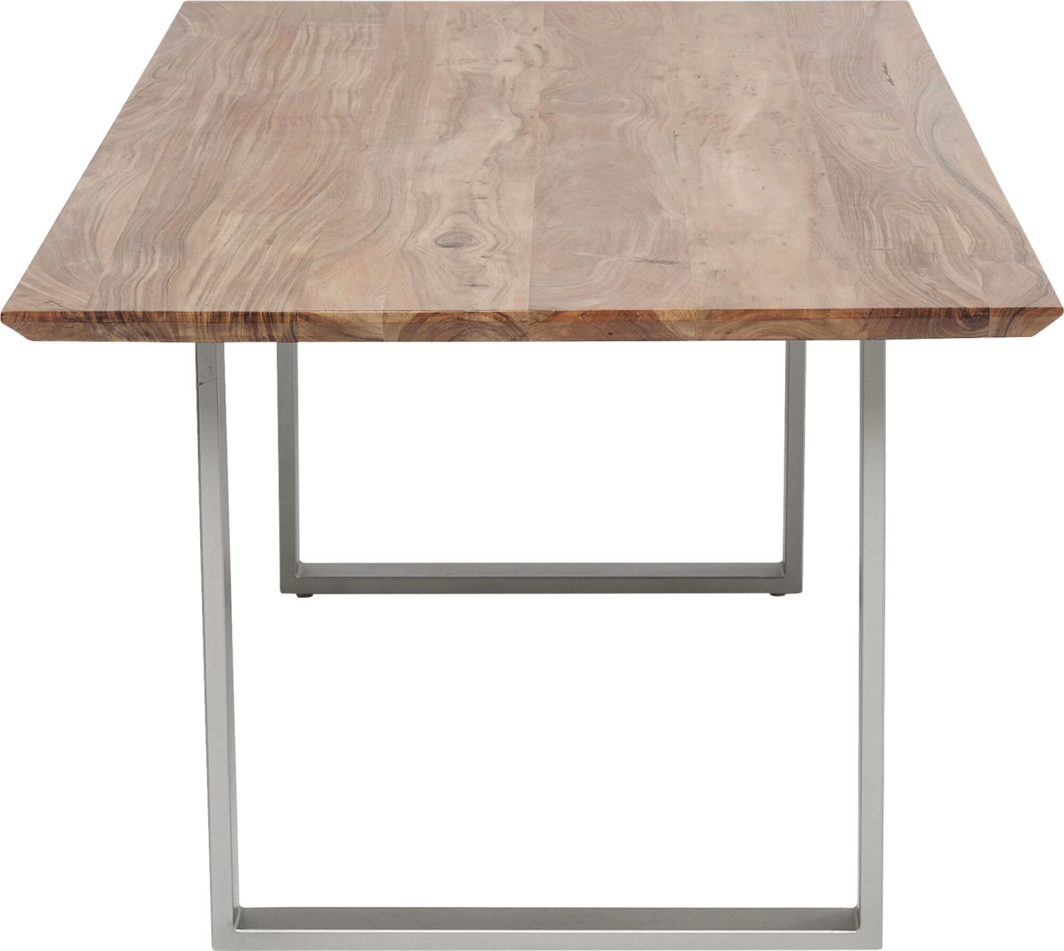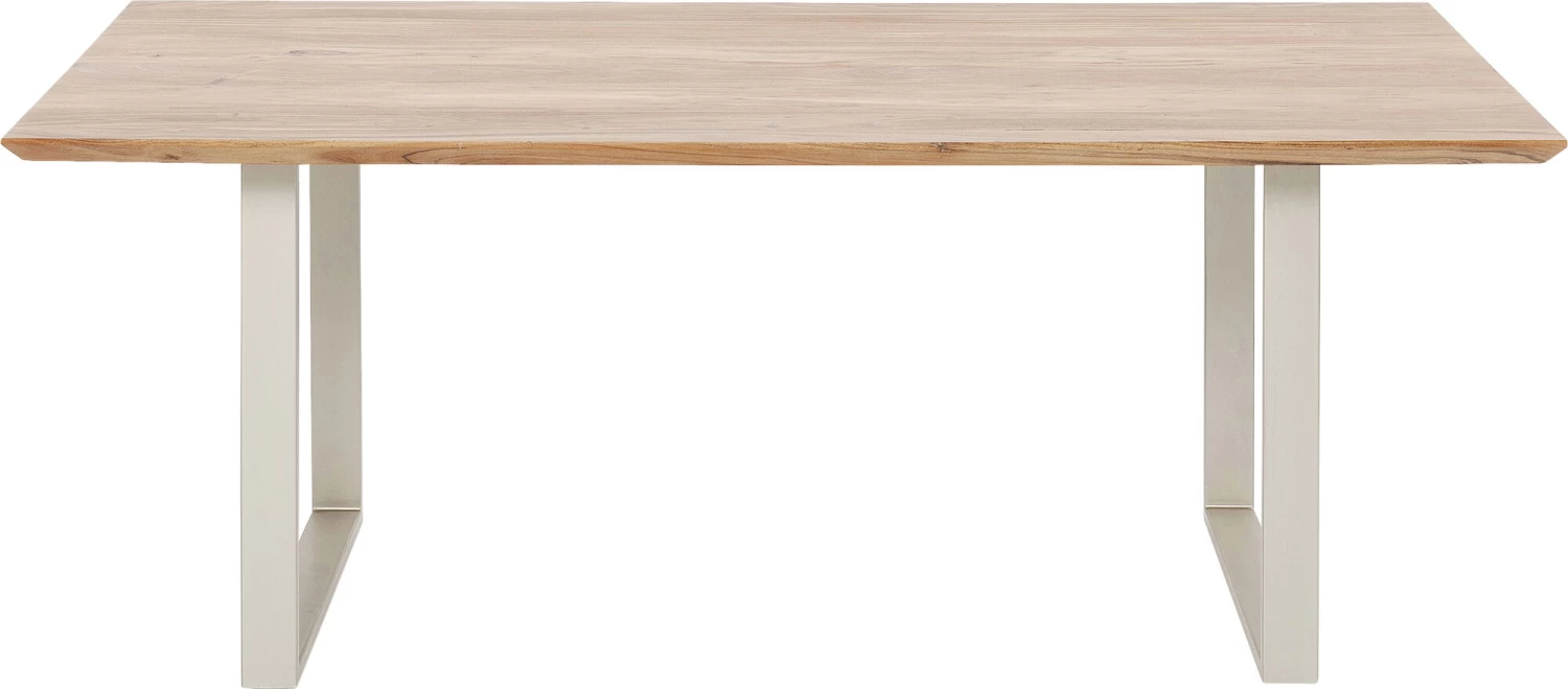 - Rechteckiger Holztisch mit Stahlkufengestell in lässigem Silberton. Massive Akazienholzplatte mit natürlich geformter Längskante