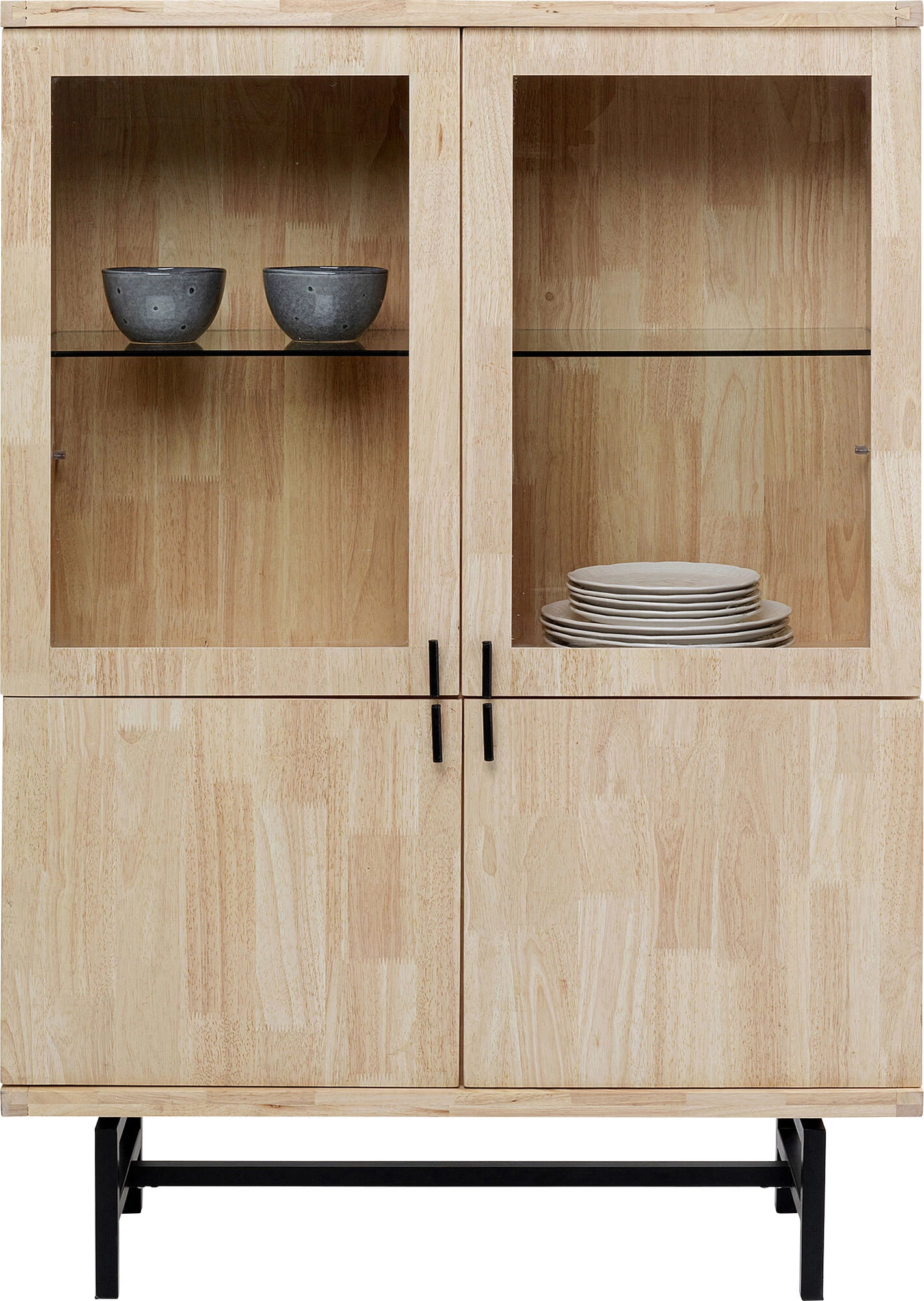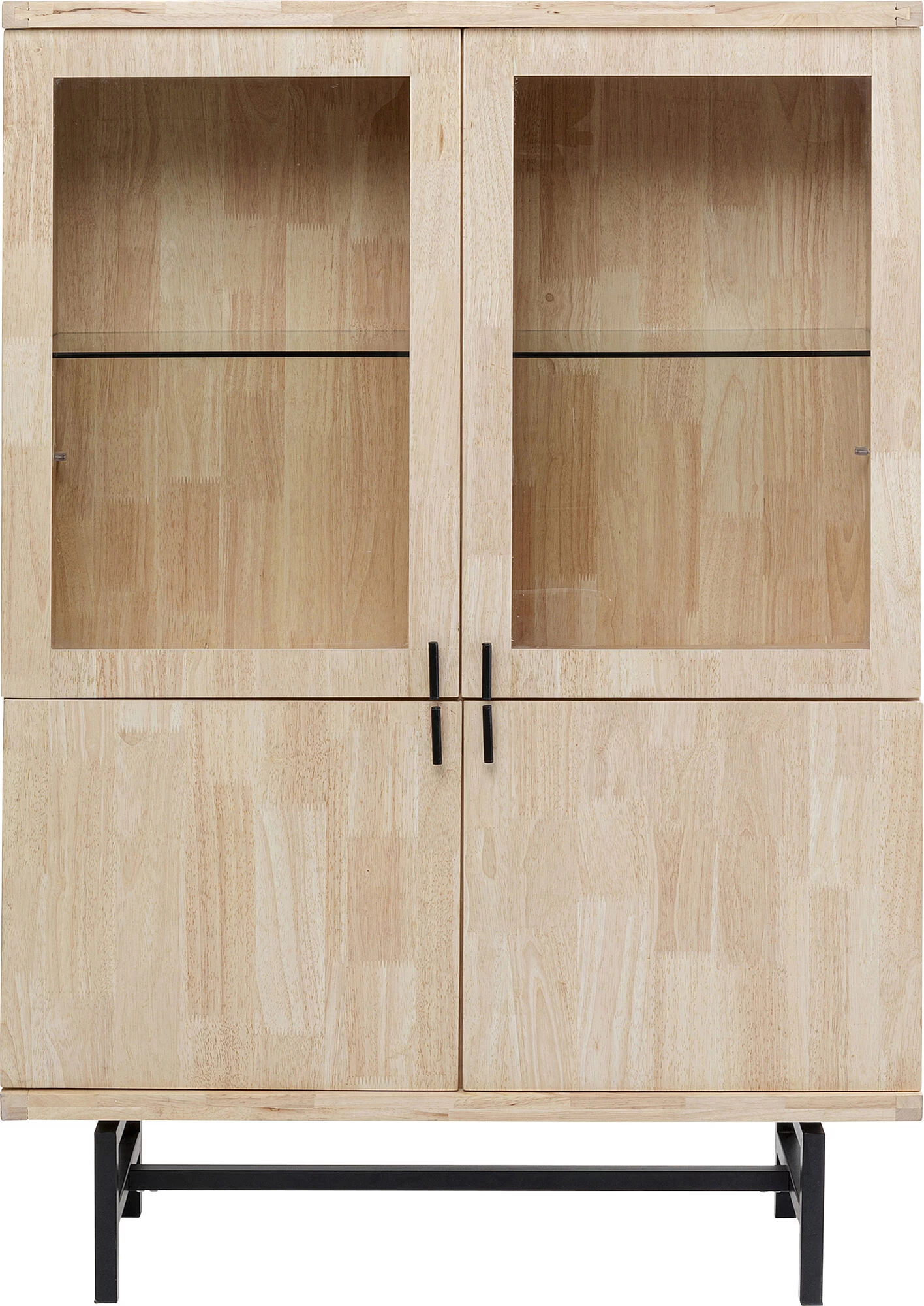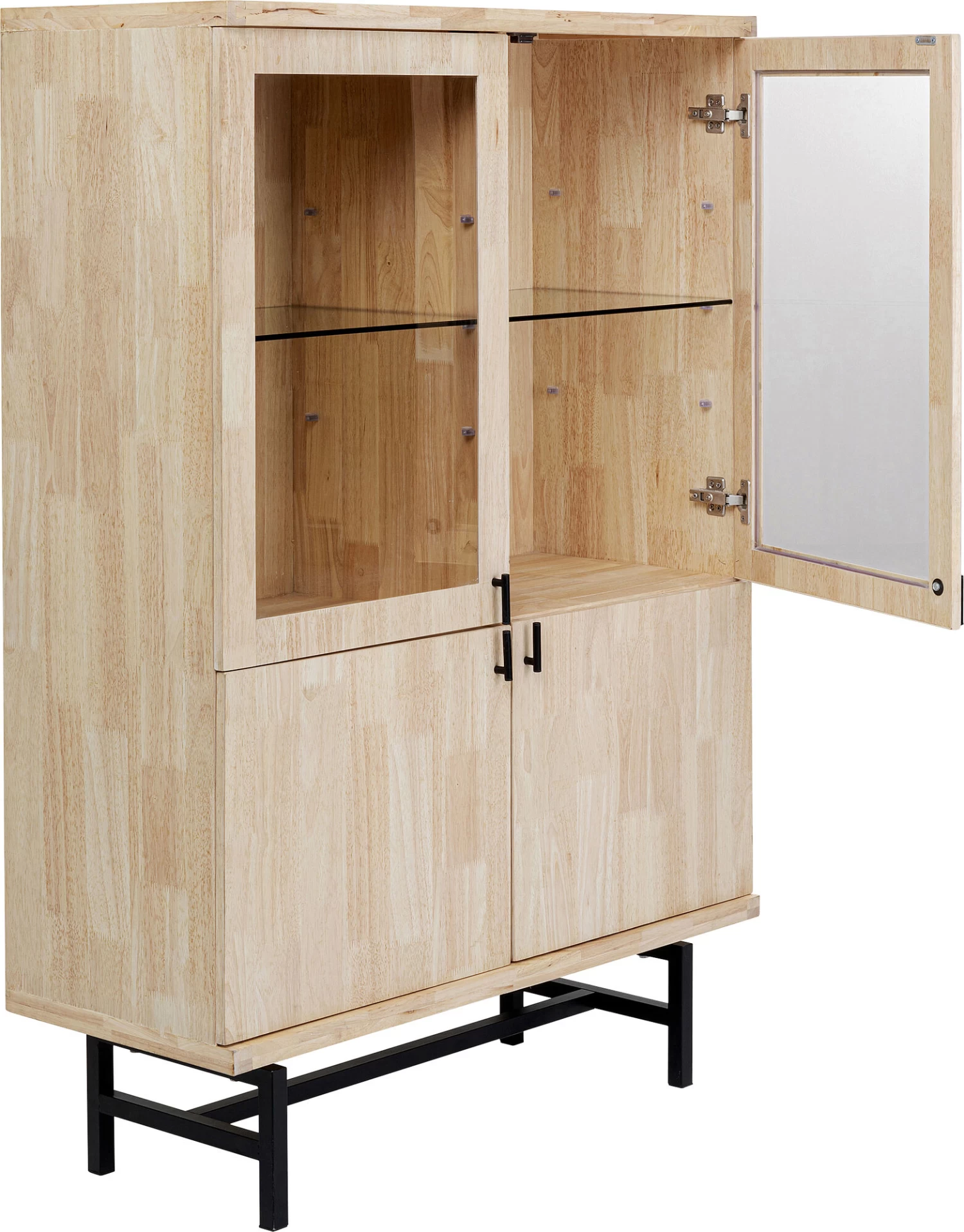 - Moderne Vitrine mit praktischen, kompakten Maßen, purem Design und hochwertigen Materialien wie Massivholz und Stahl