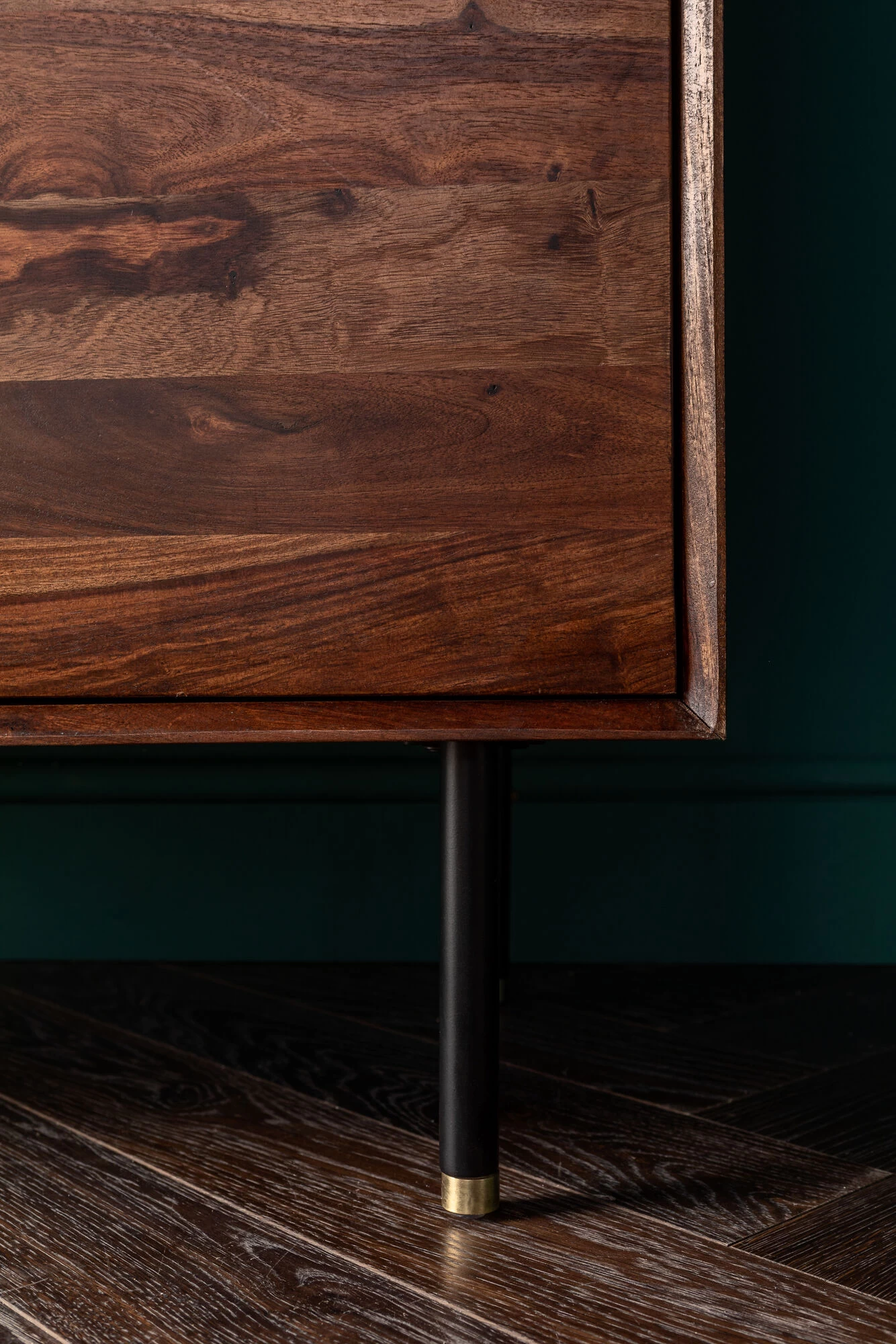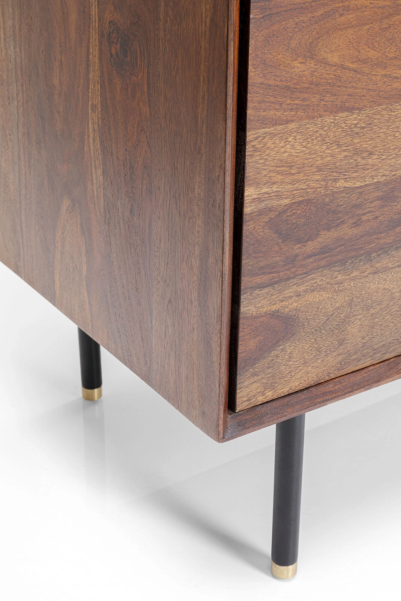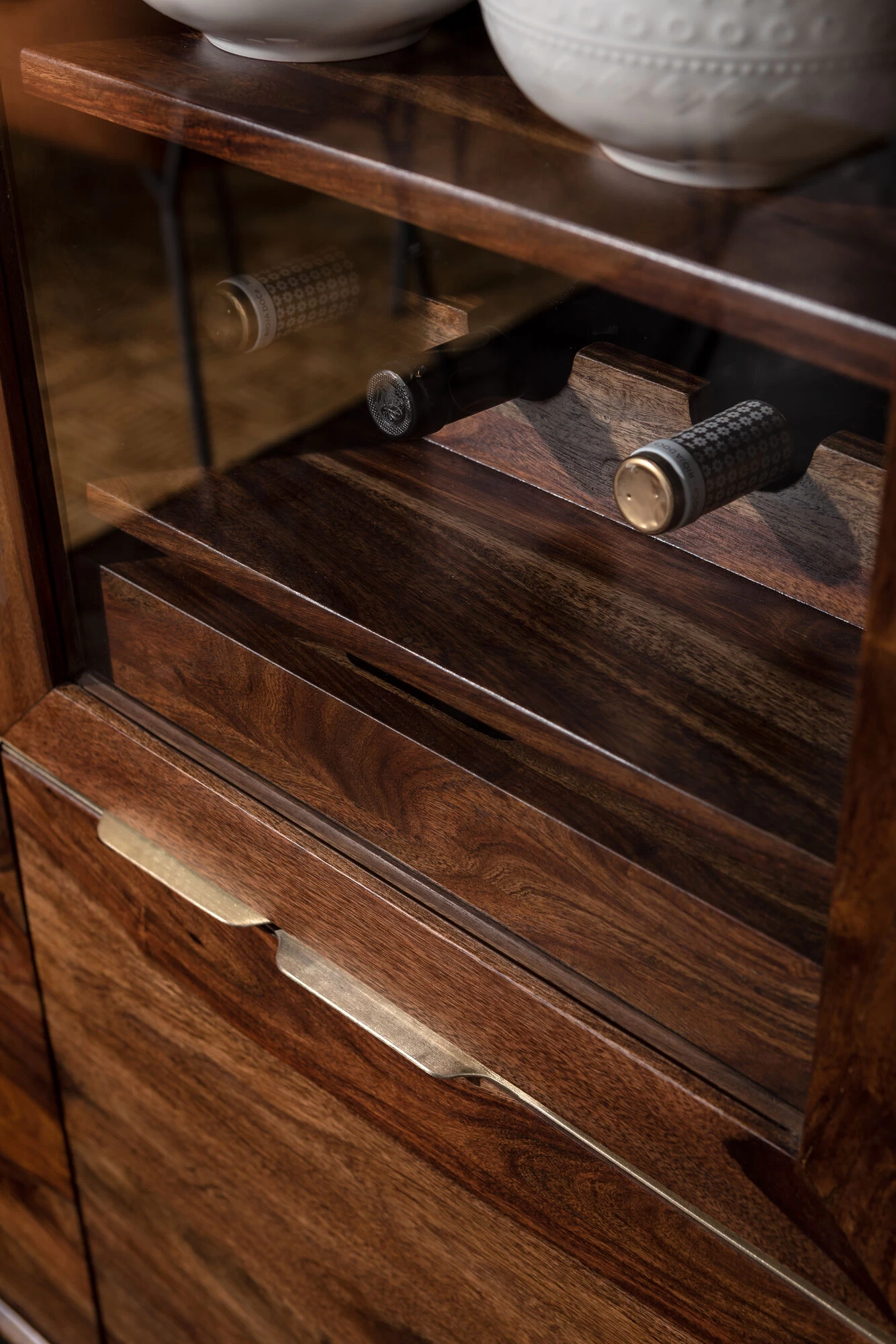 - Funktional: Flaschenhalter und Schübe hinter den Glastüren, vier Ablagefächer hinter den Holztüren